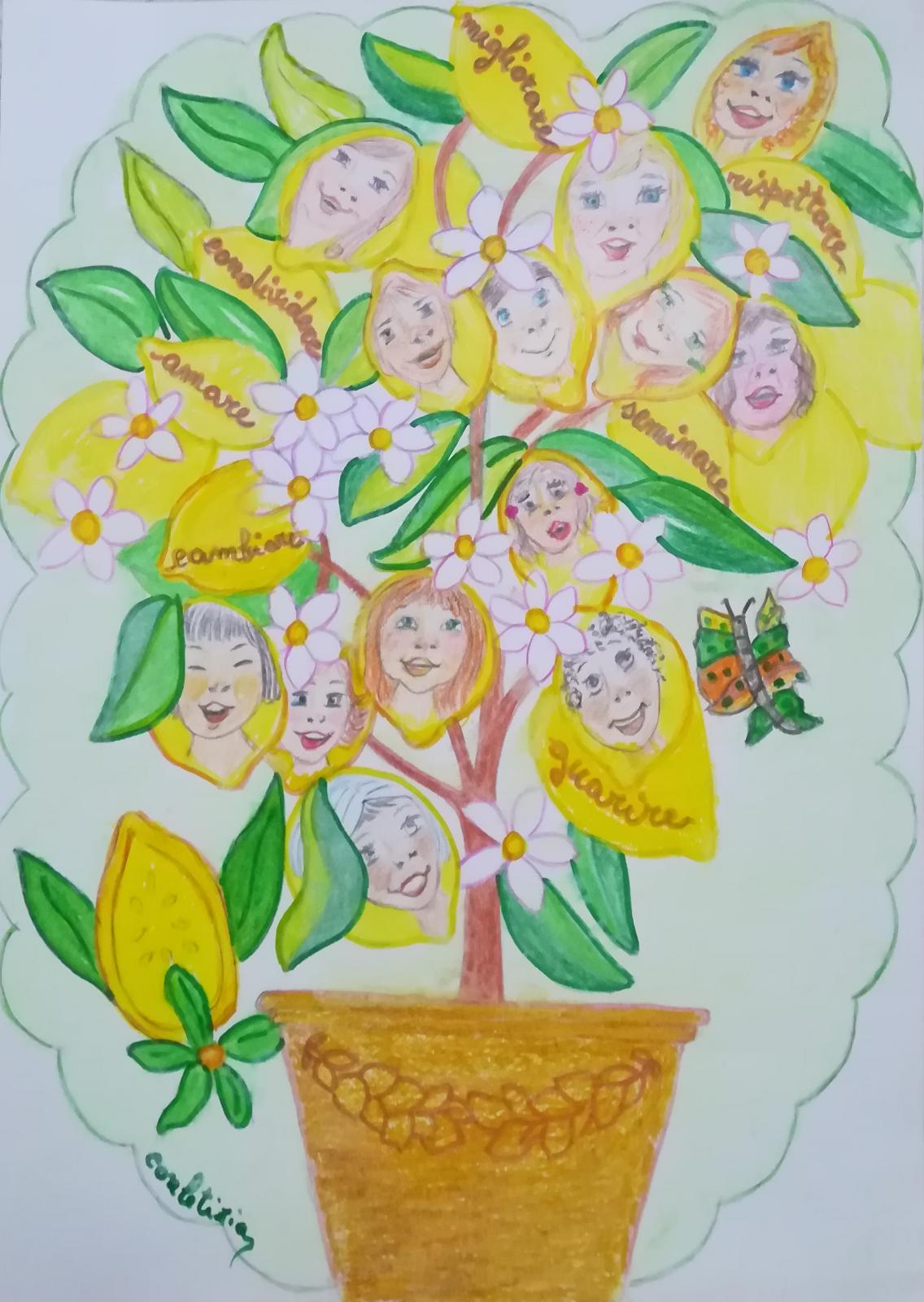 Quest’alberello di limoni è fresco, vivace e allegro. Rappresenta la nostra vita, che deve essere piena di amore e di azioni: seminare, condividere, guarire… il resto leggilo tu fra le foglie.