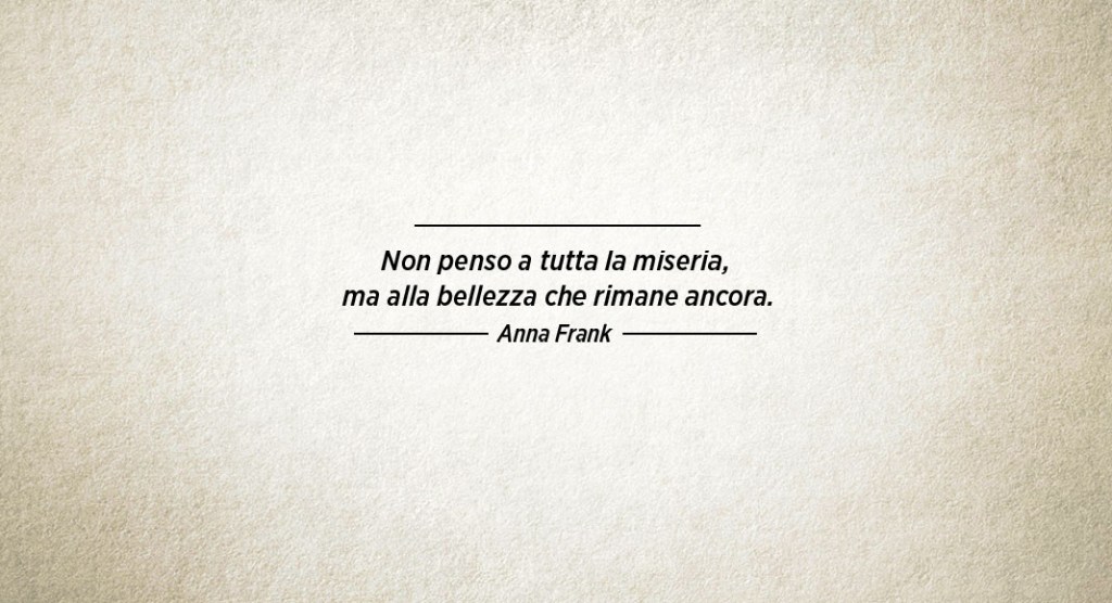 Eppure me li tengo stretti perché, malgrado tutto, credo ancora che la gente sia veramente buona di cuore. Semplicemente non posso fondare le mie speranze sulla confusione, sulla miseria e sulla morte. Vedo il mondo che si trasforma gradualmente in una terra inospitale; sento avvicinarsi il tuono che distruggerà anche noi; posso percepire le sofferenze di milioni di persone; ma, se guardo il cielo lassù, penso che tutto tornerà al suo posto, che anche questa crudeltà avrà fine e che ritorneranno la pace e la tranquillità.“