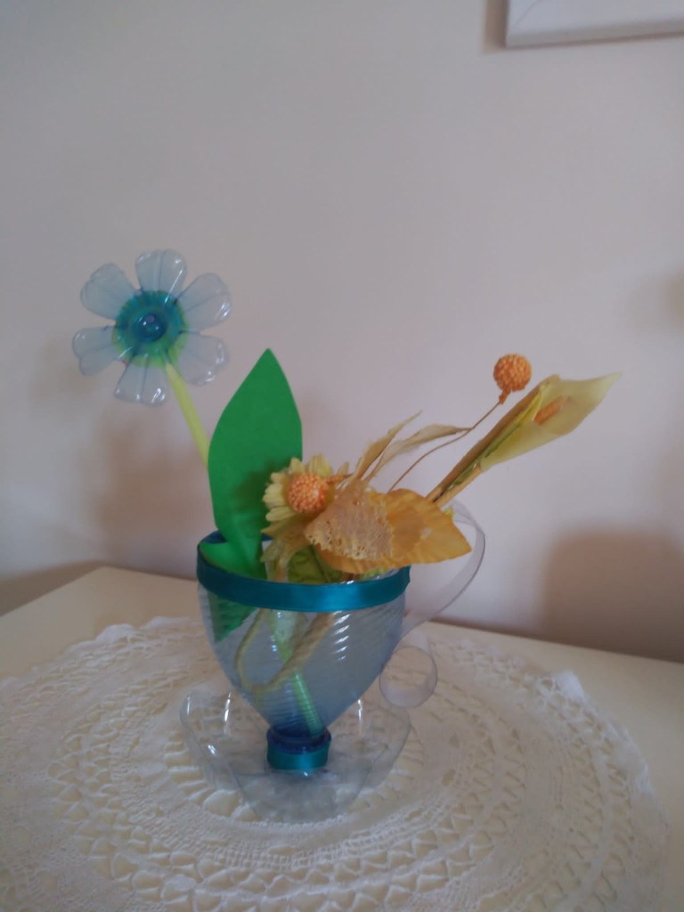 Ancora bottiglie di plastica per questi fiori e il loro vaso