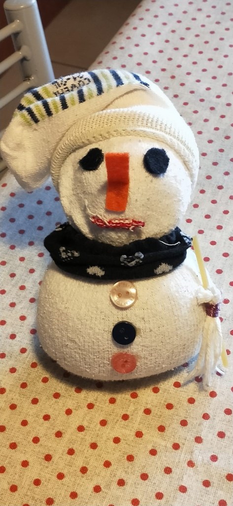 Simpatico pupazzo realizzato con calzini, bottoni, spaghetto e lana