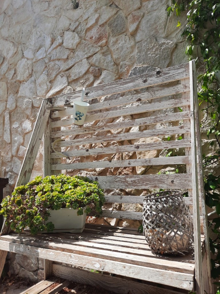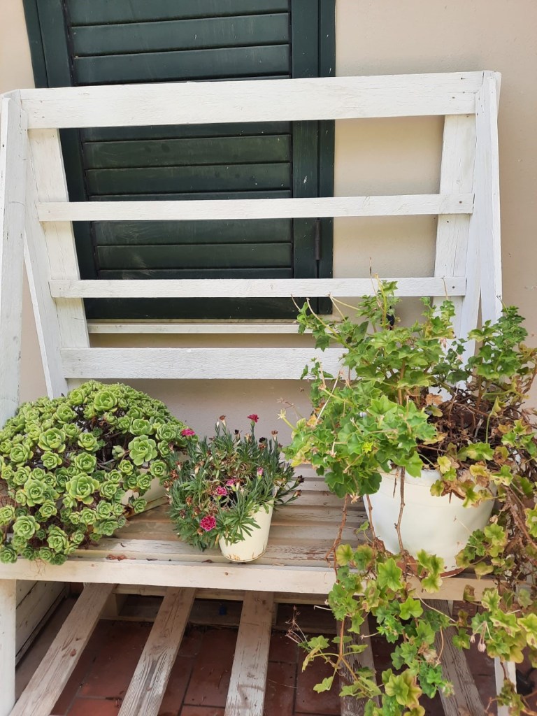 Qui un pallet serve come portavasi. Sotto, un ripiano in cui riporre gli attrezzi da giardinaggio.