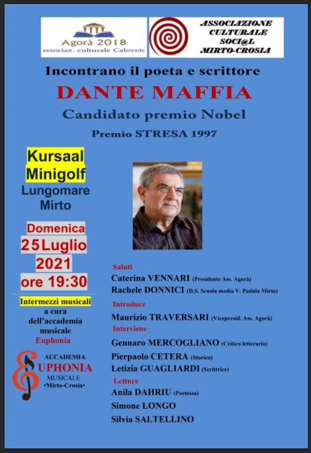 Domani sera – chi vuole – potrà incontrare Dante Maffia, narratore e saggista calabrese. Oggi è uno dei maggiori poeti che l’Italia può vantare, molto conosciuto anche al di fuori dei confini nazionali.