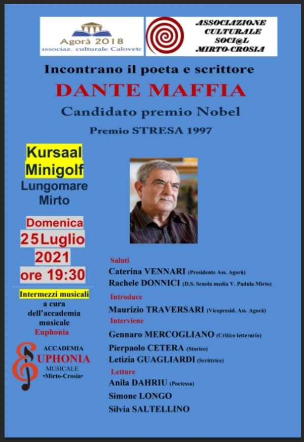 Domani sera - chi vuole - potrà incontrare Dante Maffia, narratore e saggista calabrese. Oggi è uno dei maggiori poeti che l’Italia può vantare, molto conosciuto anche al di fuori dei confini nazionali. Per chi ama i libri, ama parlarne ed è curioso di conoscere gli scrittori questo è un appuntamento da non perdere! Letizia... Continua a leggere →