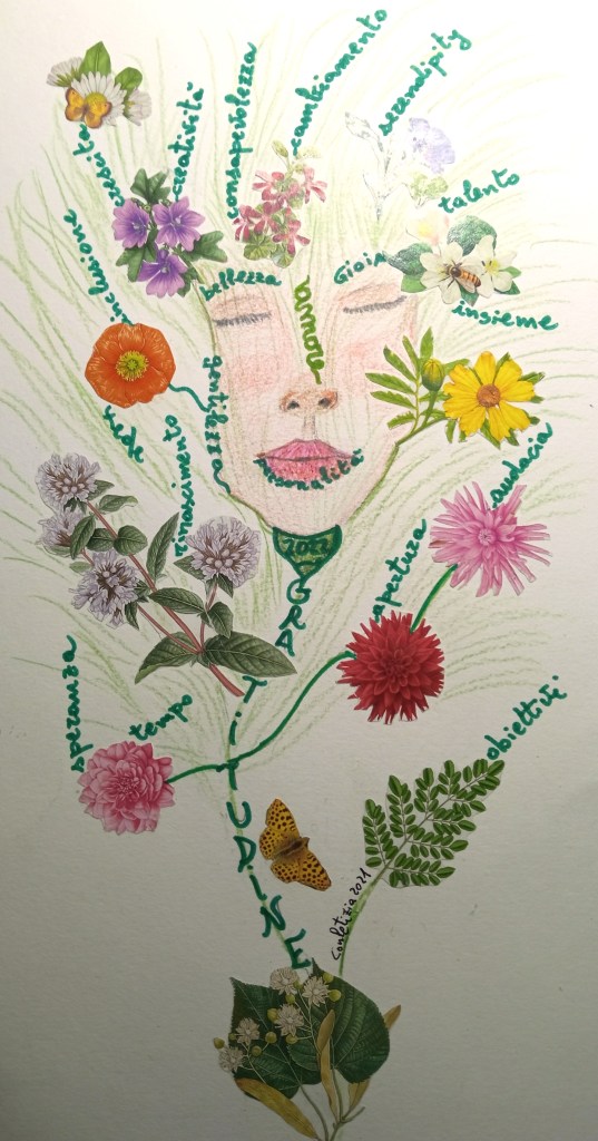 Nel disegno che ho realizzato per questo post ci sono anche tutte le altre parole che ormai da molti anni accompagnano la mia vita e il mio lavoro. Tutte, sicuramente, derivano da un atteggiamento grato, anche per le piccole cose.