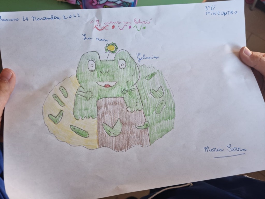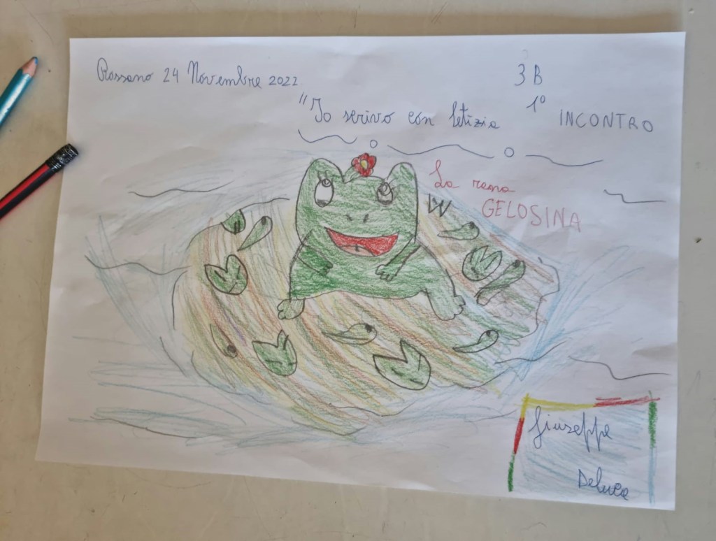 Dopo il racconto della zucca Maicontenta, stavolta scriveremo la storia della rana Gelosina. Ispirati dal suo nome, stamattina abbiamo parlato di INVIDIA e di GELOSIA. Molti bambini hanno raccontato quando hanno provato queste due forti emozioni. E sono rimasta piacevolmente sorpresa quando ho scoperto che loro sanno distinguerle molto bene. Sì, perché gelosia e invidia sono diverse: proviamo invidia quando desideriamo qualcosa che un’altra persona possiede, invece proviamo gelosia quando ci sentiamo preoccupati e temiamo che qualcuno possa portarci via quello che già possediamo.