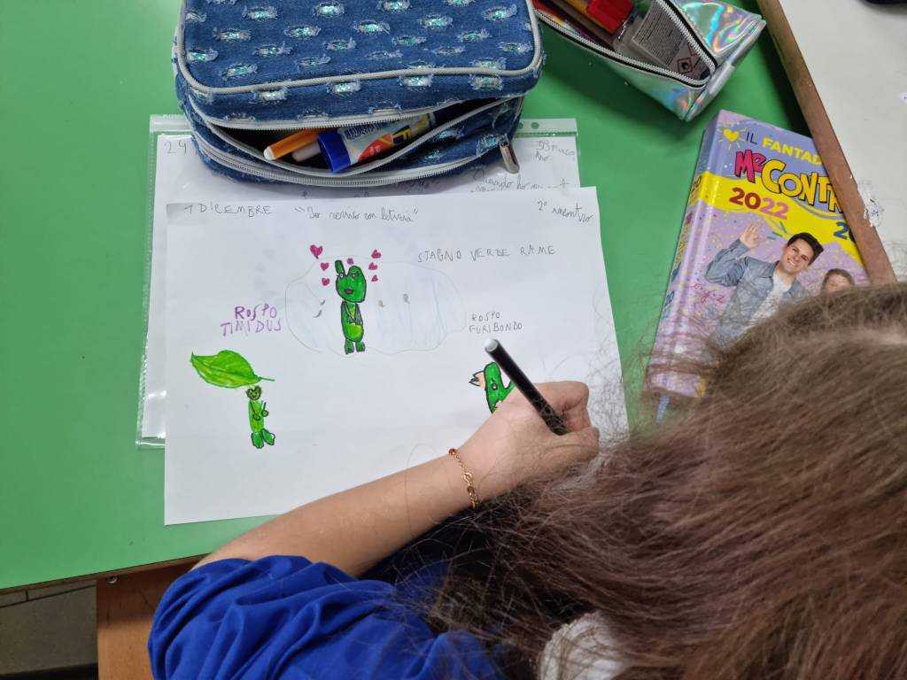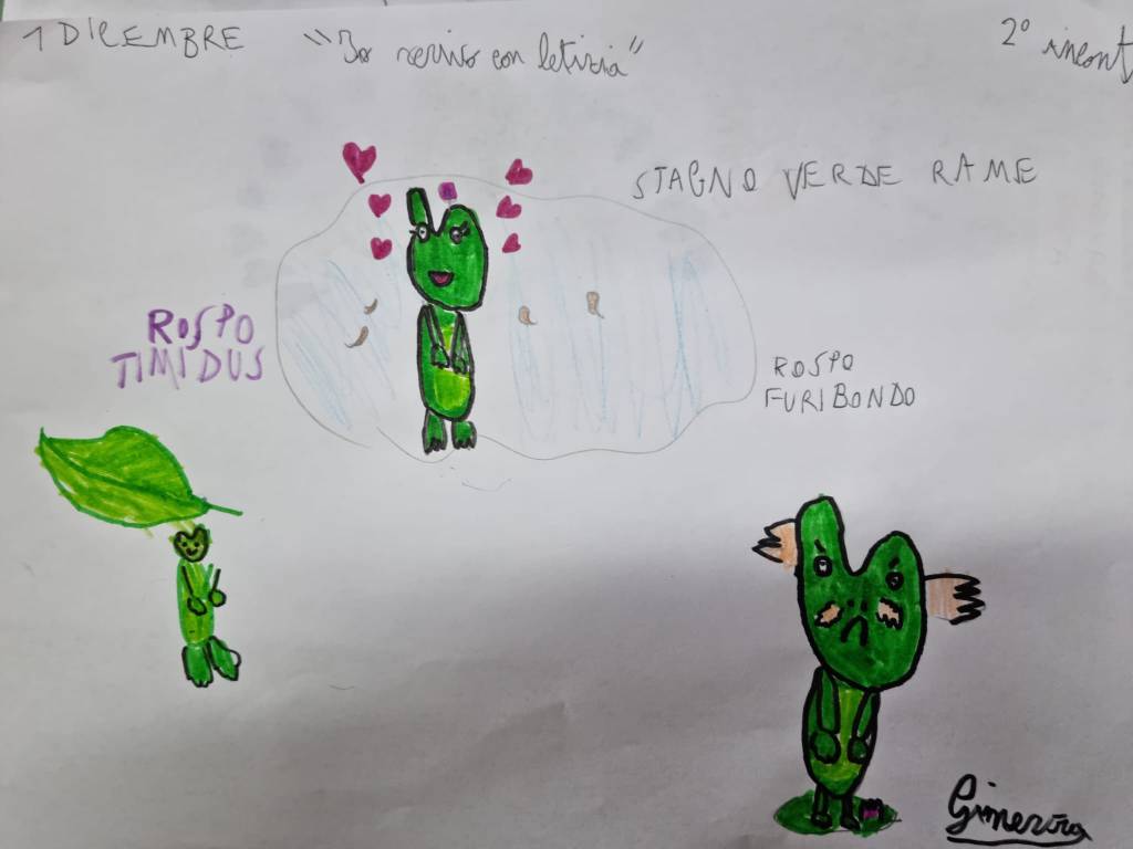 Nella storia che stiamo scrivendo io e i bambini della 3 B (Scuola Primaria “Monachelle” di Rossano) è arrivato un nuovo personaggio. È Rospo Timidus, segretamente innamorato di Rana Gelosina ma troppo timido per dirglielo. Sta nascosto sotto una grande foglia e l’ammira, l’ammira e sospira, un po’ sognando il momento in cui uscirà allo scoperto, un po’ temendo quel momento. Nel frattempo i giorni passano e la situazione non cambia. Anzi…Rana Gelosina ha occhi solo per Rospo Furibondo che, anche se è quasi sempre arrabbiato, è davvero un bel tipo. Purtroppo anche lei è timida e non osa avvicinarsi a lui. La situazione, insomma, è questa: Rospo Timidus ama Rana Gelosina ma è timido; Rana Gelosina ama Rospo Furibondo ma è timida; Rospo Furibondo…ancora non si sa! Così ci siamo lasciati io e i bambini nel secondo incontro del laboratorio di scrittura creativa “Io scrivo con letizia” ma, nel frattempo, stiamo immaginando come si evolveranno gli eventi allo Stagno Verderame.