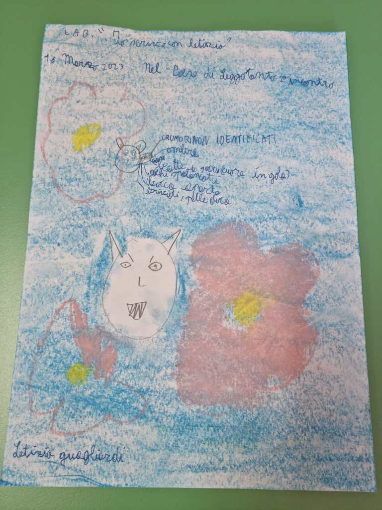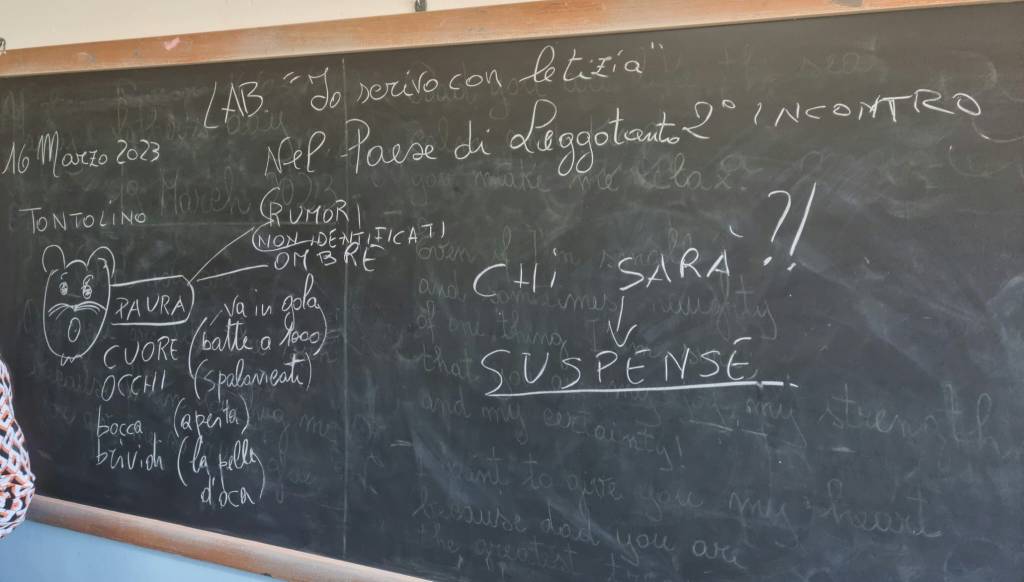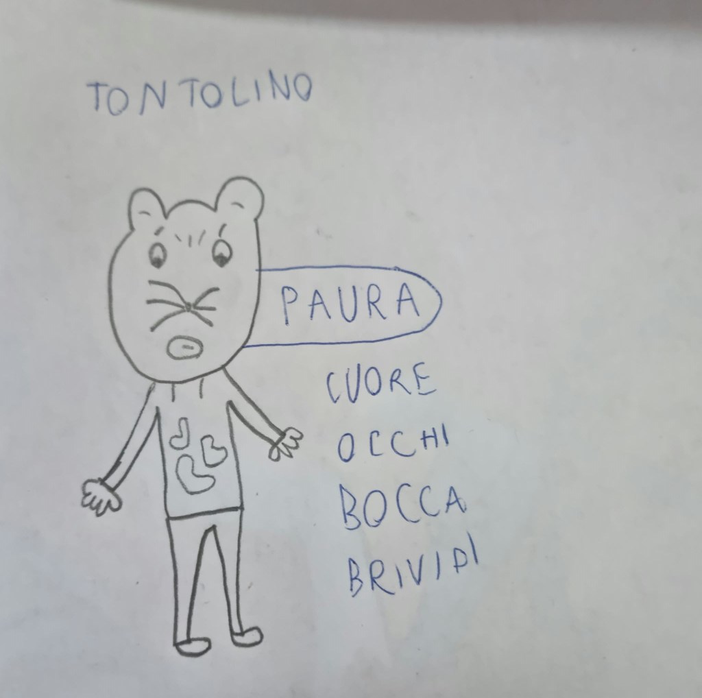 Nella nostra storia, uno dei protagonisti è Tontolino, un topino curioso ma indifeso, taciturno e fifone. A lui piace andare in giro per la biblioteca, soprattutto scoprire gli angoli più nascosti. Una sera, proprio mentre è in uno di questi giri di perlustrazione, sente dei rumori indefiniti, vede un’ombra minacciosa e comincia a provare la paura. E così, io e i miei piccoli scrittori abbiamo descritto le sensazioni che proviamo quando qualcosa ci spaventa. Come diventa il nostro viso? E gli occhi? E il cuore che fa? E il respiro? Più sapremo rappresentare come reagisce il protagonista di fronte a un evento che lo spaventa, più sapremo coinvolgere il lettore.