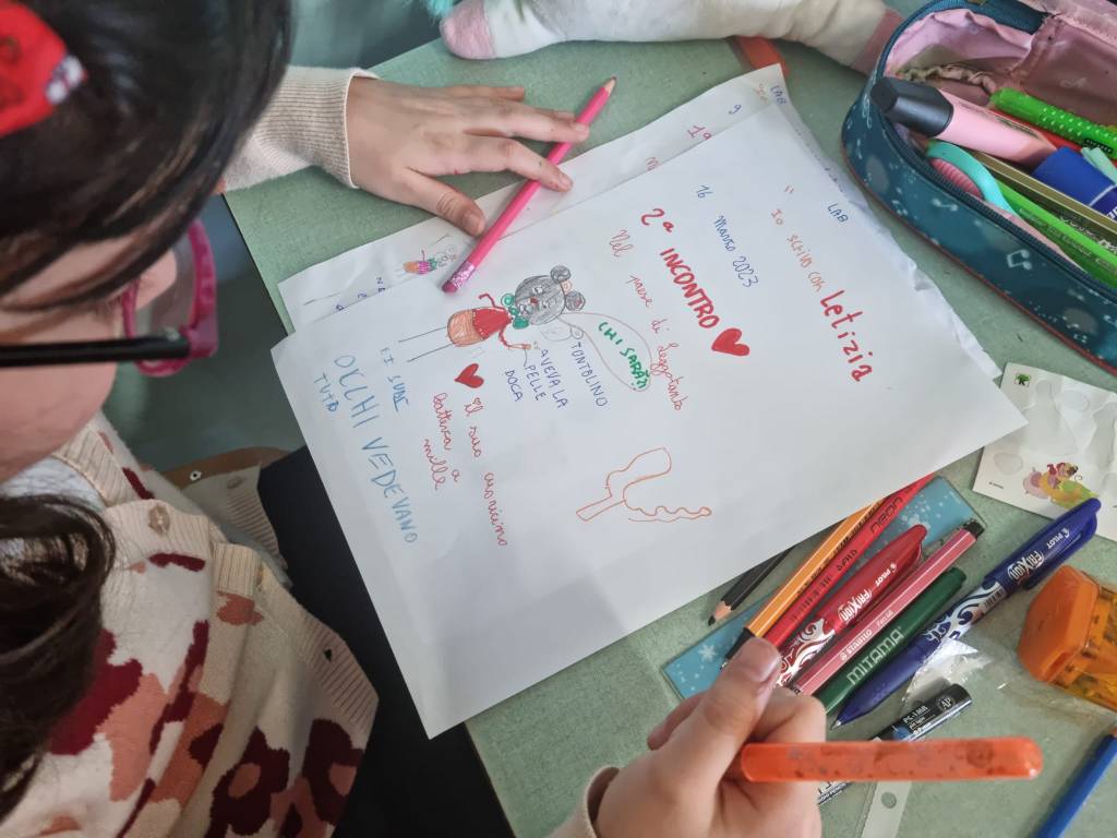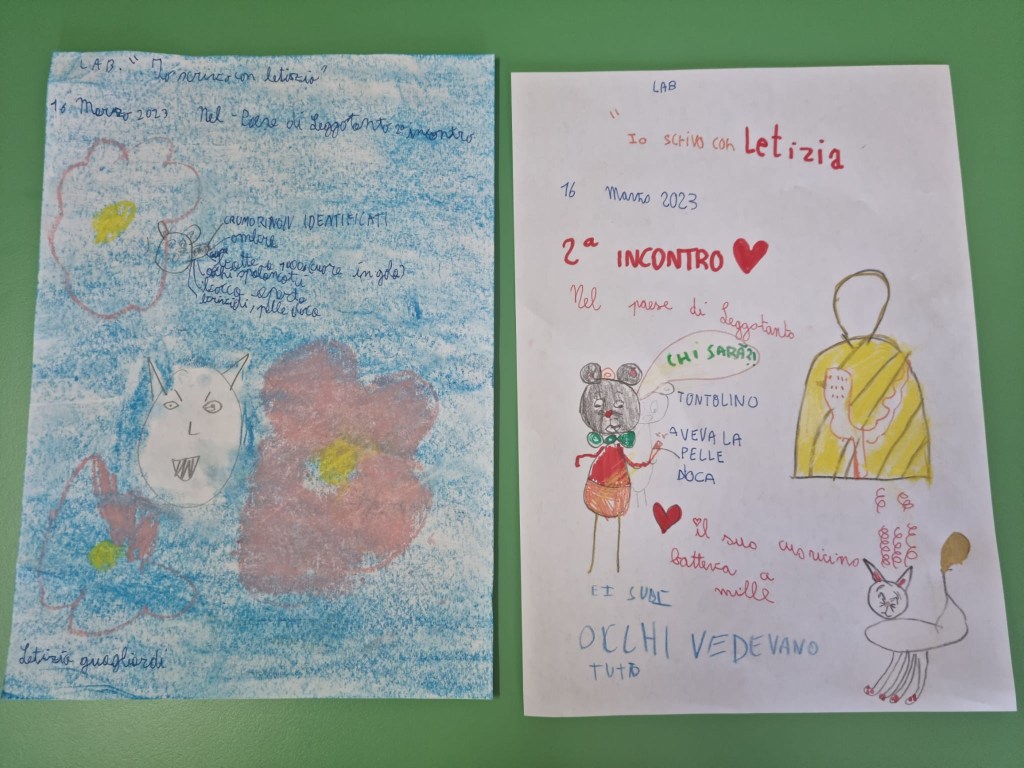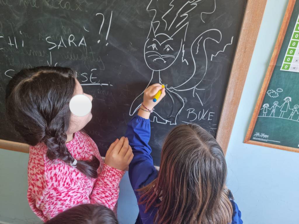 E così siamo arrivati a parlare dei bulli. Chi è il bullo? Perché si comporta così? Come sceglie le sue vittime? Devo dire che i bambini sono preparati su questo argomento e analizzando il comportamento di Tontolino e di Bulletto hanno visto che il vero debole, fra i due, è proprio il gatto. Una delle cose che mi piacciono di più del mio laboratorio è che, attraverso la scrittura e i disegni vengono fuori le emozioni, altre storie che si intrecciano a quella che si sta scrivendo insieme e si allena – oltre alle abilità di scrittura – anche l’empatia, cioè la capacità di immedesimarsi negli stati d’animo dei personaggi narrati.