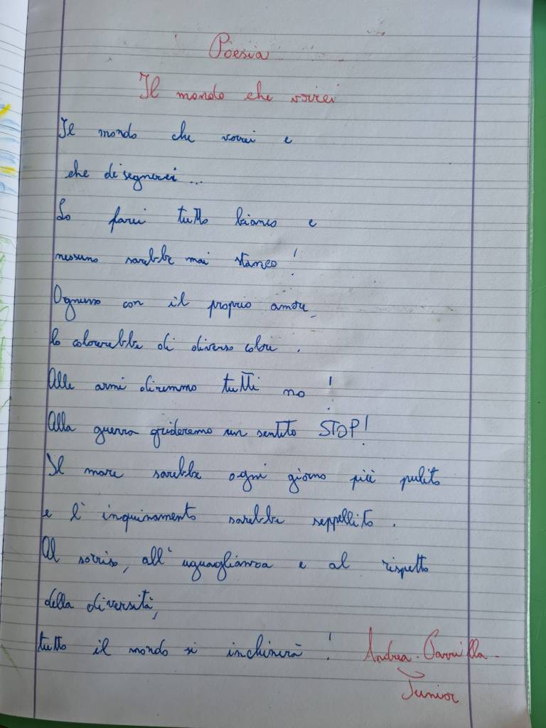 Buona serata, Letizia! Sono molto “sognante”. Quando leggo le poesie mi avvolgo in atmosfere particolarmente suggestive, ancora di più stasera quando i miei occhi si soffermano su versi scritti da una bimba di 8 anni: Aurora! La poesia è brivido e tu, piccola, quanti me ne dai! Speri in un mondo migliore! “Il mare sarebbe ogni giorno più pulito e l’inquinamento sarebbe seppellito, all’uguaglianza e al rispetto delle diversità, il mondo si inchinerà”. Brava! Hai colto i problemi dei nostri tempi! La natura non ci chiede nulla: solo rispetto! Fette di popolazioni che chiedono accoglienza nella nostra Italia. Accogliamo le diversità. Tutto il mondo è pieno di sofferenze! Anche noi, Aurora, insieme a te speriamo in un mondo migliore. È ora di cambiare!