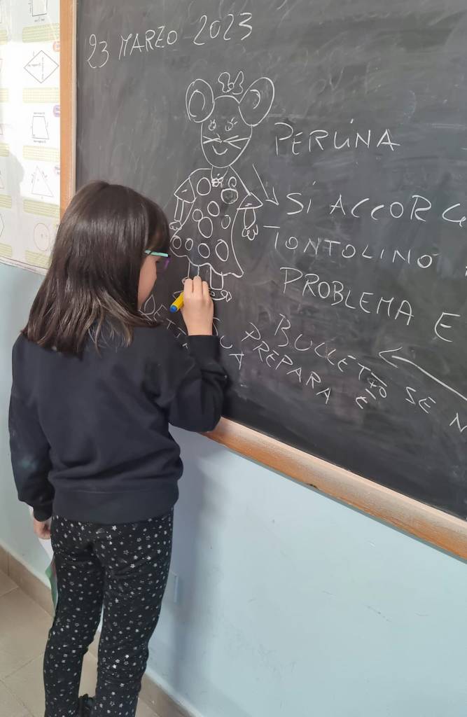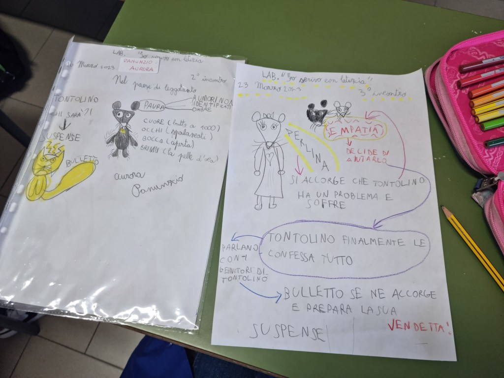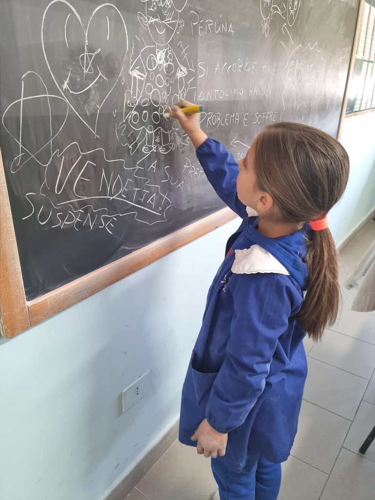 Noi oggi – per riuscire in questa impresa – ci siamo immedesimati in Tontolino (cosa prova?), in Perlina (perché vuole aiutare il suo amichetto?) e perfino in Bulletto (perché si comporta così?). Poi abbiamo discusso di come si reagisce in questi casi.