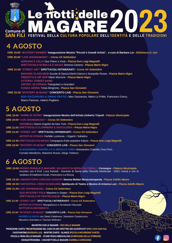 L’evento, giunto alla XIV edizione e inserito nel più ampio Festival estivo promosso dall’Amministrazione Comunale che prende il nome di San Fili TerraMagarae, si terrà il 4-5-6 agosto 2023. L’ospite d’eccezione di quest’anno sarà la cantautrice Mariella Nava, che vanta numerose collaborazioni illustri.