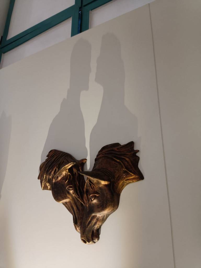 Quelle appese al muro sono delle figure note, per esempio nella prima ci sono due teste di cavalli ma…ho acceso un interruttore e sul muro si sono proiettate altre forme: le teste dei cavalli sono le ombre di un uomo e di una donna. E lo stesso per le altre due: a prima vista sono una cosa, con la luce diventano altro.