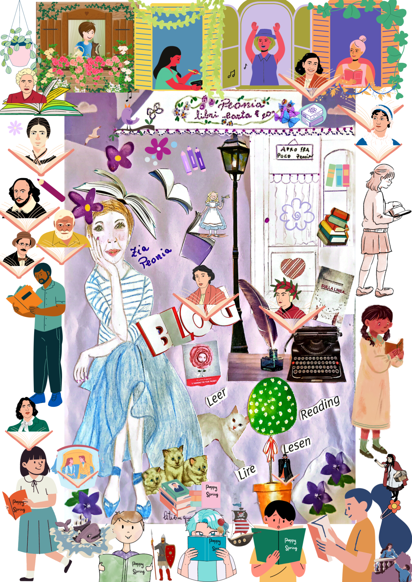 “Con zia Peonia mi diverto molto perché è ironica e ama i libri come me, cioè, io amo i libri come lei. La sua libreria, proprio in piazza, è bellissima, un luogo fantastico perché lì non ci trovi solo libri. Ci sono penne che non trovi da nessun’altra parte, biglietti di ogni tipo, cartoleria assortita che ci perdi ore a osservare tutti i gadgets. E poi lampade per la lettura, segnalibri, tazze e teiere sfiziosissime, candele di tantissime profumazioni, portachiavi e calamite.”