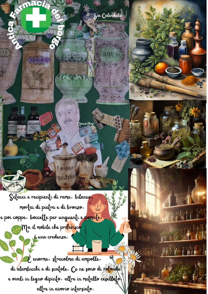 “L’Antica Farmacia del borgo è gestita da mio nonno Pino e prima di lui c’era suo padre e prima ancora suo nonno. Insomma è davvero antica ed è anche l’unica del nostro borgo. Non vende solo medicine ma è anche erboristeria e ogni tanto io e Primula ci divertiamo a osservare zia Calendula, la sorella di mio padre.” (brano e immagine tratti da “Poppy Spring – diario di primavera”)