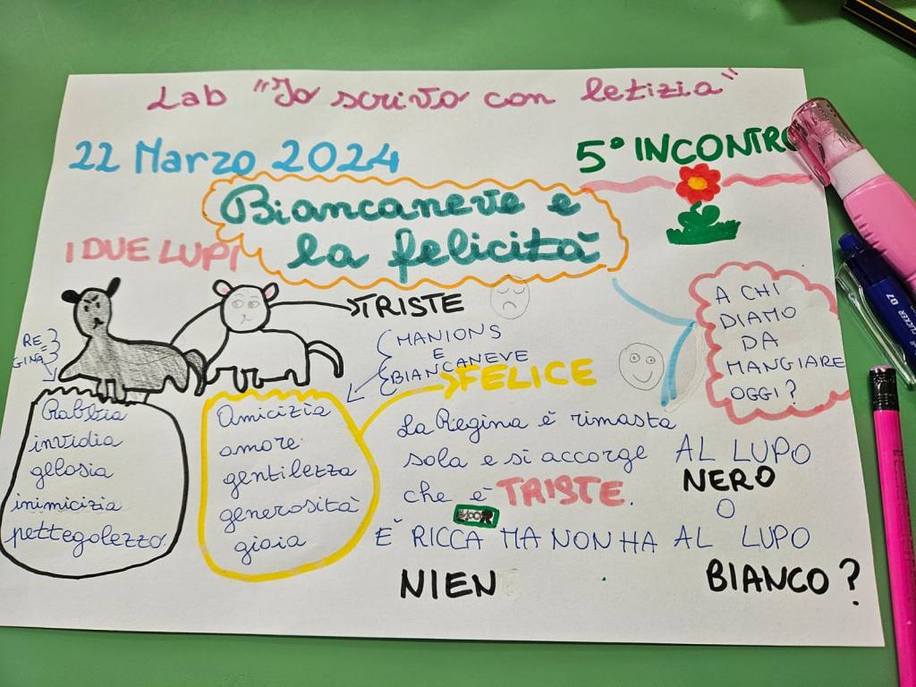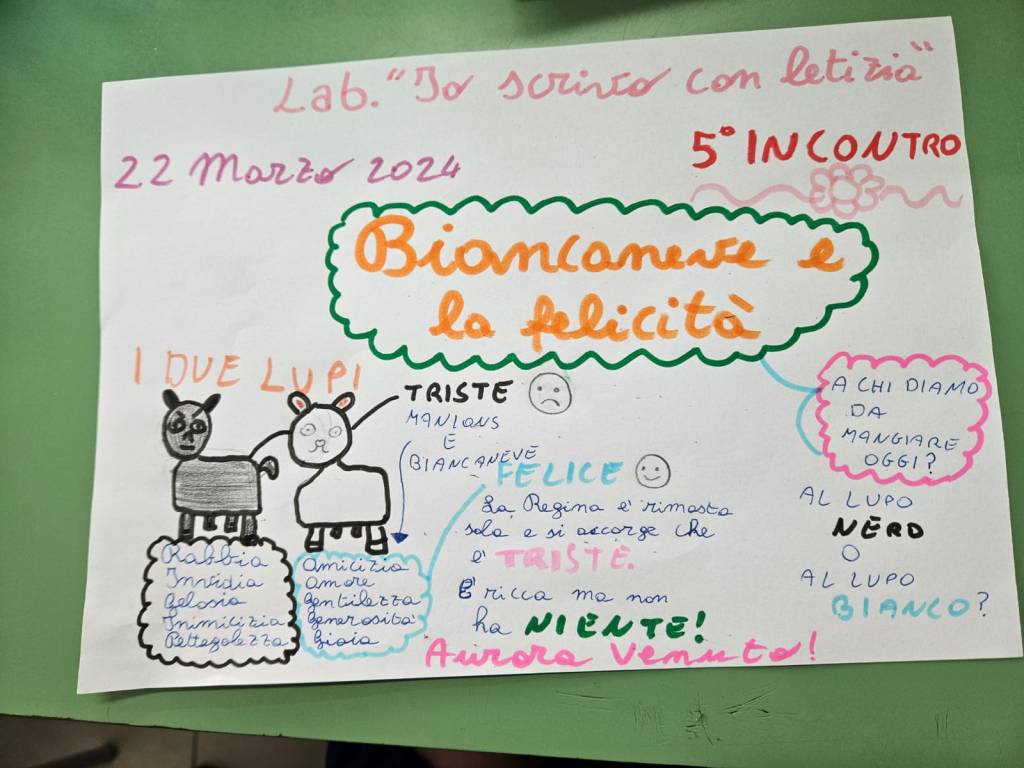 E così hanno scritto, disegnato (anche i due lupi, quello bianco e quello nero) e riflettuto: ognuno di noi può scegliere di essere felice. Il finale della nostra personale storia di Biancaneve è questo: