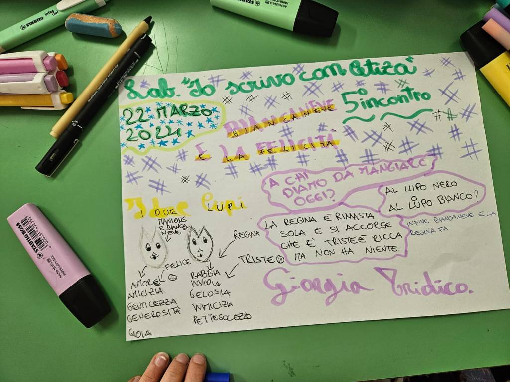 Ringrazio molto la maestra Maria Antonietta Ruperto che mi ha supportato durante gli incontri di questo Laboratorio e abbraccio i miei piccoli, entusiasti scrittori: è stata una bella avventura trasformare Biancaneve in una ragazza di oggi, riflettere insieme su alcuni aspetti negativi del nostro carattere e renderci conto che il cambiamento è sempre possibile, se noi lo vogliamo. Soprattutto, è stato bello inventare, immaginare e anche sognare ad occhi aperti. E renderci conto che questo è ciò che ci offre con generosità la scrittura.