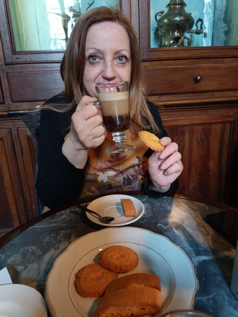 Il bicerin: è una bevanda calda tipica torinese bevuta soprattutto nelle stagioni fredde dell’anno per ristorarsi dal clima rigido della città. Ernest Hemingway ha inserito il bicerin nella sua lista delle 100 cose da salvare come patrimonio dell’umanità. Gli ingredienti sono: caffé espresso, latte, cioccolato fondente, panna fresca e zucchero. Dopo la visita al palazzo reale ne ho assaporato uno proprio nella caffetteria che ha l’ingresso dalla Corte d’Onore e si trova nelle antiche sale del Servizio di Frutteria, un luogo fin dal Settecento dedicato alla conservazione di porcellane pregiate.