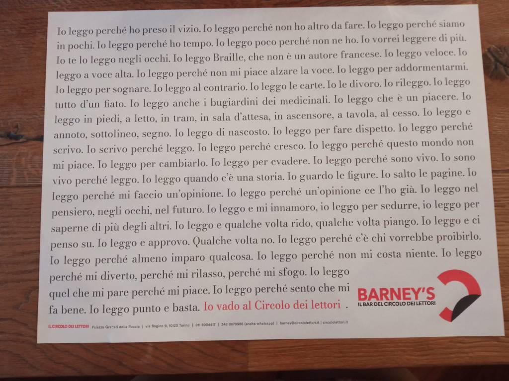 Tra i ristoranti in cui ho mangiato quello che mi ha affascinata – ça va sans dire – è stato il Barney’s del Circolo dei lettori. Questo circolo propone un’offerta ricca e diversificata di incontri ed eventi e mette quotidianamente a disposizione le proprie sale di lettura a chi cerca un posto tranquillo per studiare o lavorare nel settecentesco Palazzo Graneri della Roccia, in via Bogino 9, già sede del Circolo degli Artisti. Nato nel 2006, il Circolo dei lettori è un centro culturale dinamico, curioso e innovativo: presentazioni editoriali, incontri con grandi autori – italiani e internazionali – e di piccole case editrici, reading, spettacoli, confronti e dialoghi. Ritrovarsi intorno ai libri per condividere mondi e punti di vista, idee e passioni.