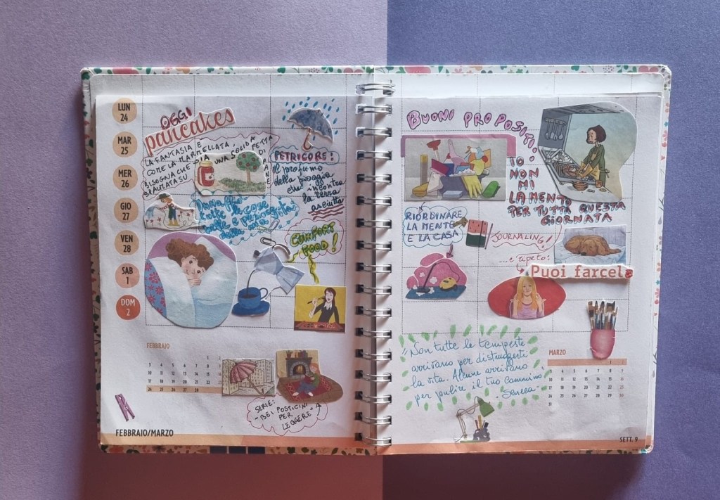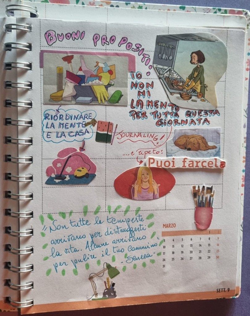 Nella seconda pagina del suo diario settimanale ha fissato uno dei suoi tanti, buoni propositi: “Non mi lamento per tutta questa giornata”: ha scoperto che lamentarsi soltanto è uno spreco di tempo e di energia. C’è anche un memo: “riordinare la mente e la casa” – perché aver cura della nostra casa è anche un po’ aver cura di noi stessi.