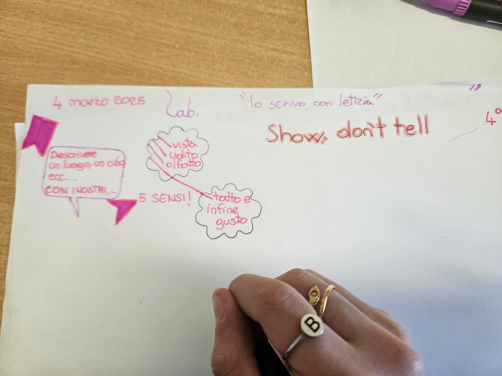 Come si fa a mostrare in modo vivo un comportamento, un luogo, un cibo senza descriverlo? Usando i nostri cinque sensi che mettono in gioco anche le emozioni e i sentimenti. E così un semplice “piove” si sostituisce mostrando che tipo di pioggia è, come cade, se è gentile o cade a scrosci, ecc. Un semplice “c’è il sole” può trasformarsi in qualcosa che davvero riscalda: come sono i suoi raggi? Cosa stanno illuminando? Invece di dire “Sentì un rumore” mettiamo i sensi in allerta se mostriamo cosa sente il personaggio: dei passi? Un ronzio? Un sussurro? Un cigolio? E come reagisce?
