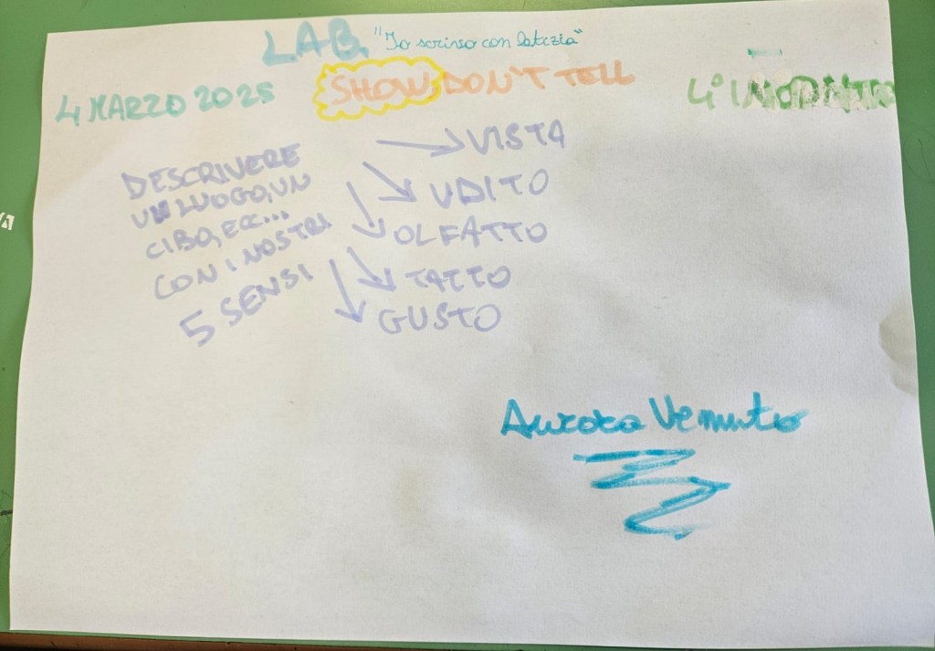 “Mostra, non descrivere” è una regola fondamentale per gli scrittori che non vogliono annoiare i lettori ma, al contrario, coinvolgerli nella loro narrazione. Questo è stato il tema del 4° incontro del mio laboratorio di scrittura creativa con i bambini della 5 B (Scuola Primaria “Monachelle” di Rossano).