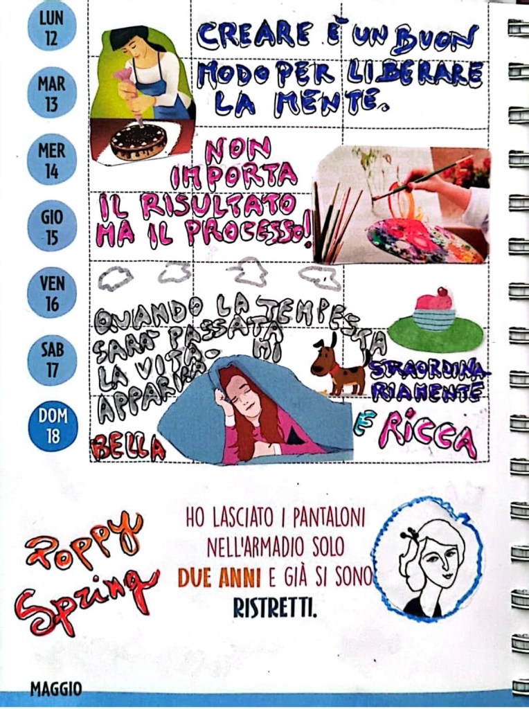 Questa seconda settimana di maggio si preannuncia piena di attività creative perché creare aiuta a liberare la mente. Quando creiamo, ci inoltriamo in territori inesplorati e affrontiamo nuove sfide, sperimentiamo idee nuove e troviamo soluzioni innovative che, spesso, si rivelano utili anche nel lavoro e in altri campi della nostra vita. Il meme appuntato da Poppy Spring nella sua agenda settimanale è chiaro: NON IMPORTA IL RISULTATO MA IL PROCESSO! Significa che noi impariamo e miglioriamo durante il percorso, se poi i risultati ci soddisfano tanto meglio!