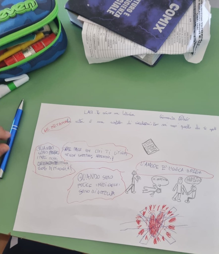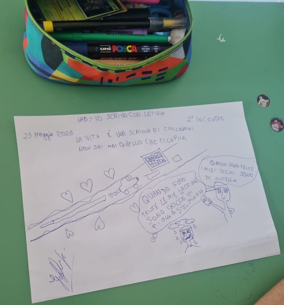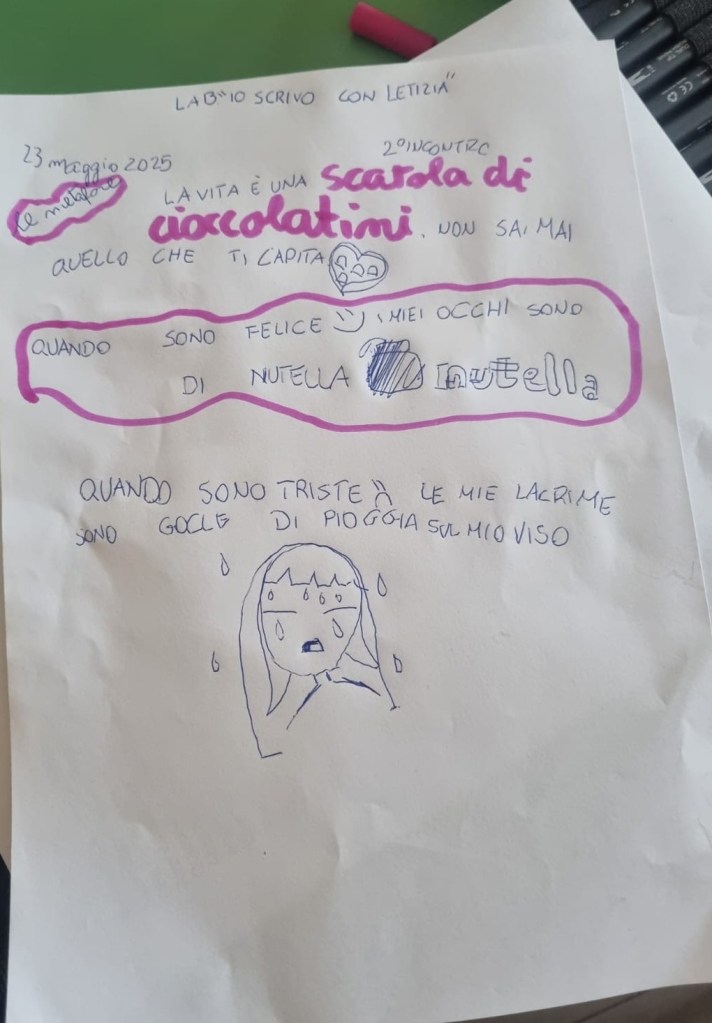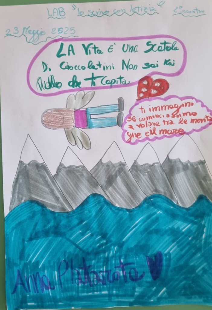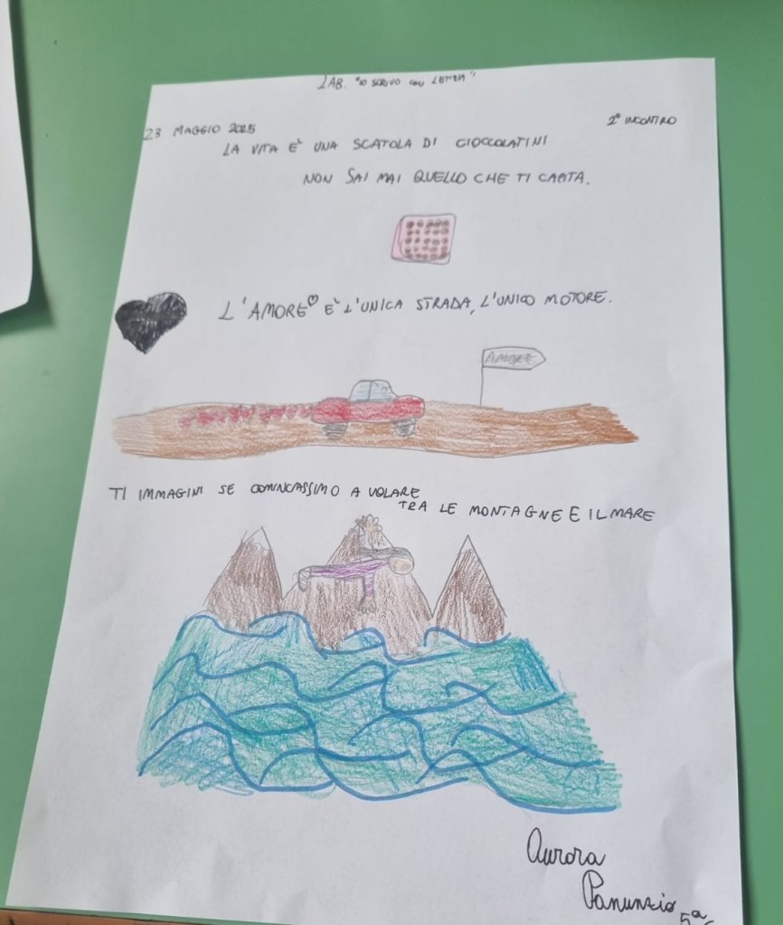 Nel secondo incontro del mio laboratorio di scrittura creativa con i bambini della 5 C (Scuola Primaria “Monachelle” di Rossano) abbiamo esplorato l’isola delle metafore. Nella canzone che stiamo analizzando – “Abbi cura di me” di Simone Cristicchi – ce n’è una: la natura è un libro di parole misteriose e io ho ricordato quella del film “Forrest Gump”: La vita è una scatola di cioccolatini. Non sai mai quello che ti capita.