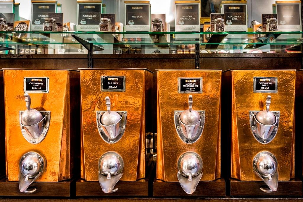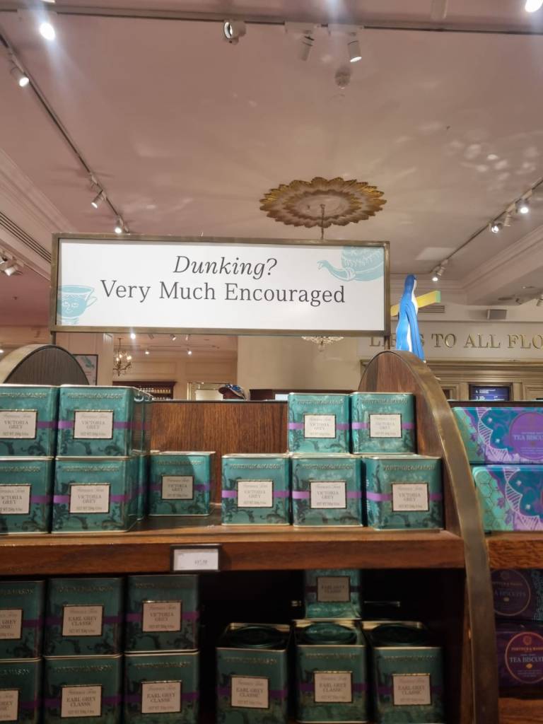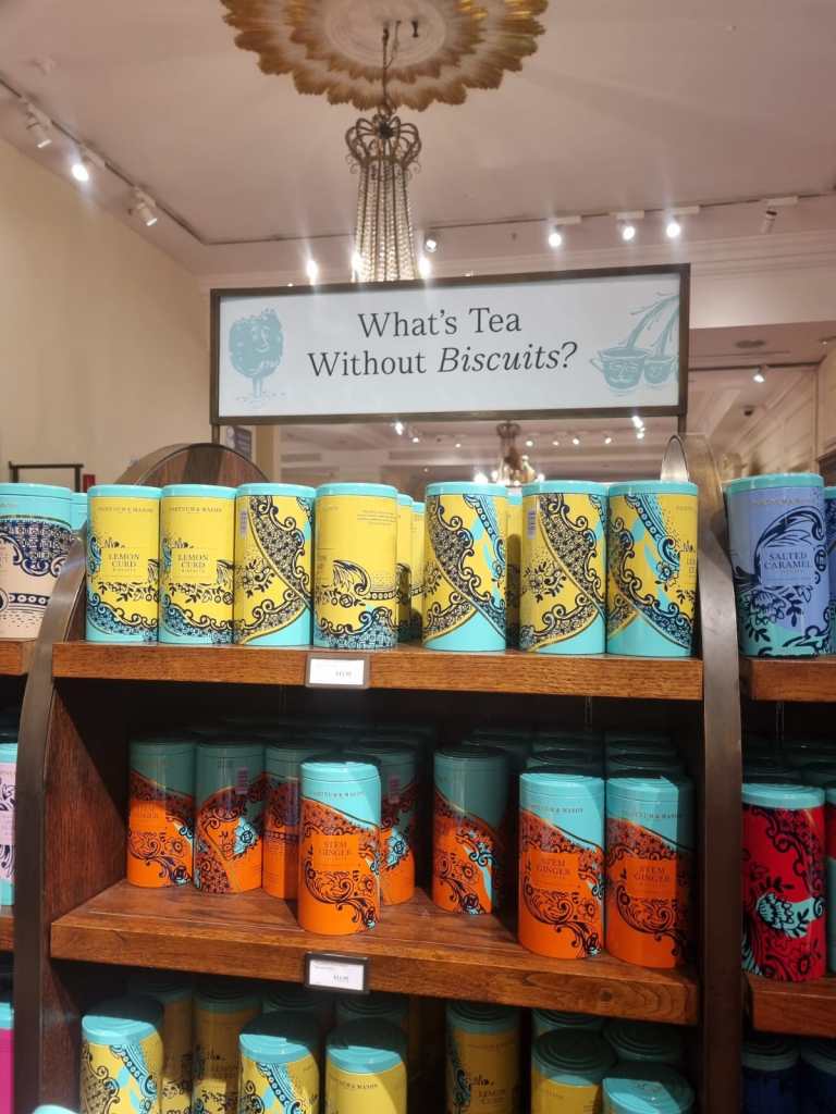 Twinings – Non ancora abbastanza inebriata da tutti questi aromi e profumi, sono andata da Twinings, al 216 Strand. Fondato da Thomas Twining nel 1706, è stato il primo negozio al mondo dove poter acquistare il tè. All’inizio il negozio divenne noto come “Golden Lion” (il Leone d’oro) poiché, non esistendo ancora la numerazione stradale, Twinings decise di contrassegnarlo con il simbolo di un leone d’oro, divenuto poi emblema dell’azienda nel mondo. Sull’esterno del negozio campeggia ancora la vecchia insegna di Twinings, dove il leone d’oro è in compagnia di uomini dagli abiti cinesi, a testimoniare le stesse origini del tè. Qui ci sono sia i prodotti classici come l’Earl Grey e l’English Breakfast, sia le miscele più innovative e pregiate. Anche qui una marea di teiere e tazze, setacci e tanti altri accessori che gli appassionati del tè apprezzano molto.