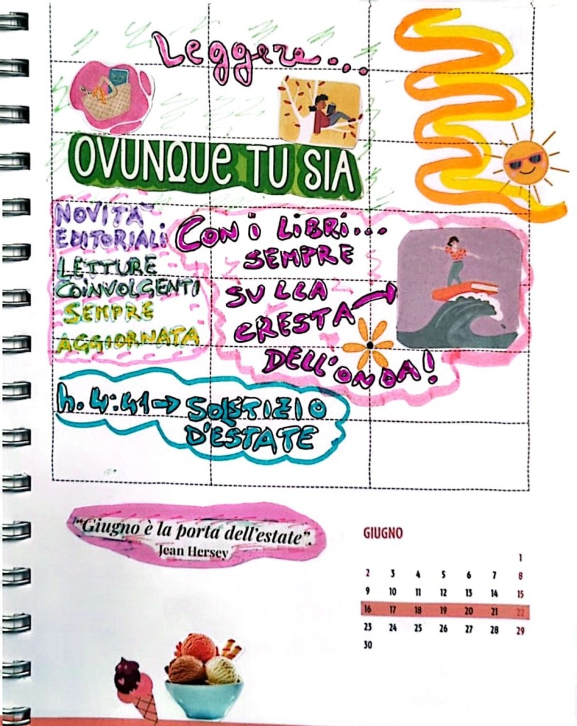 Infine, la frase “Giugno è la porta dell’estate”: sabato 21 alle h. 4:41 entreremo ufficialmente in questa nuova stagione. Giornate più lunghe, più calde, voglia di uscire, di cercare posti “freschi”, di nuotate al mare, di passeggiate in montagna, di viaggi, di meritate vacanze.