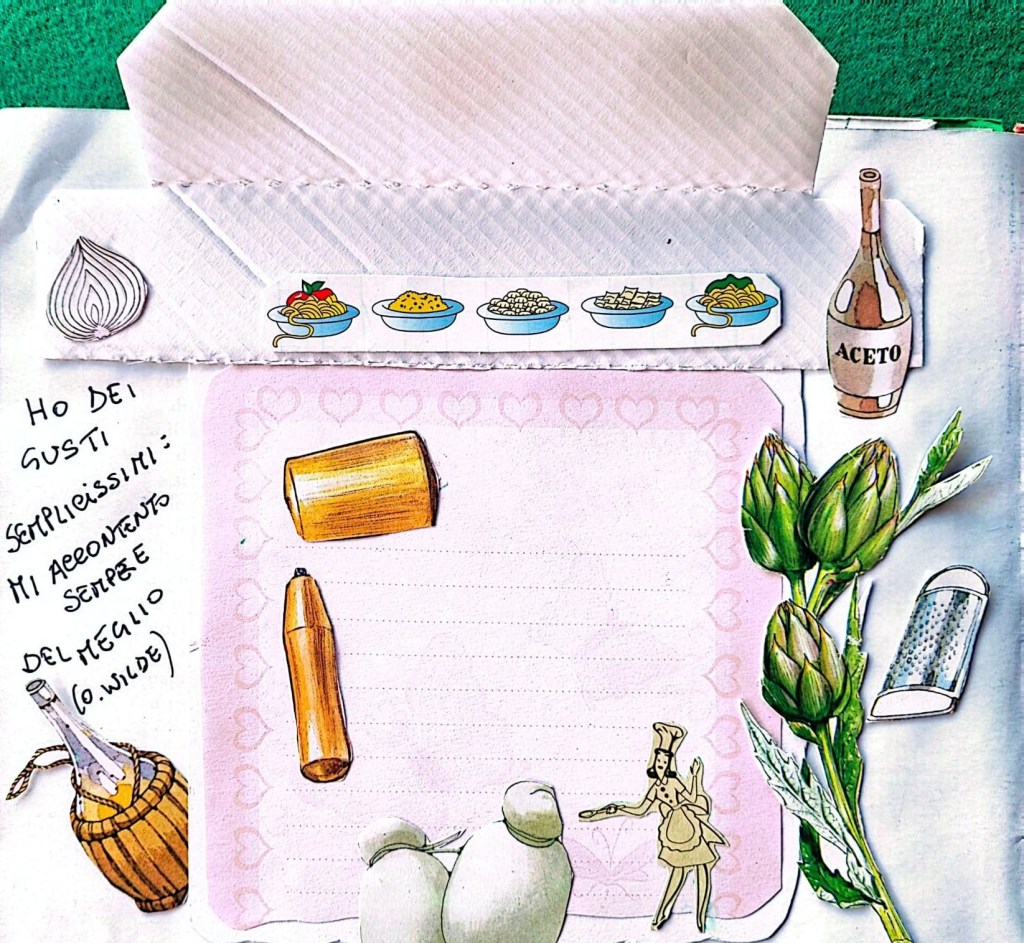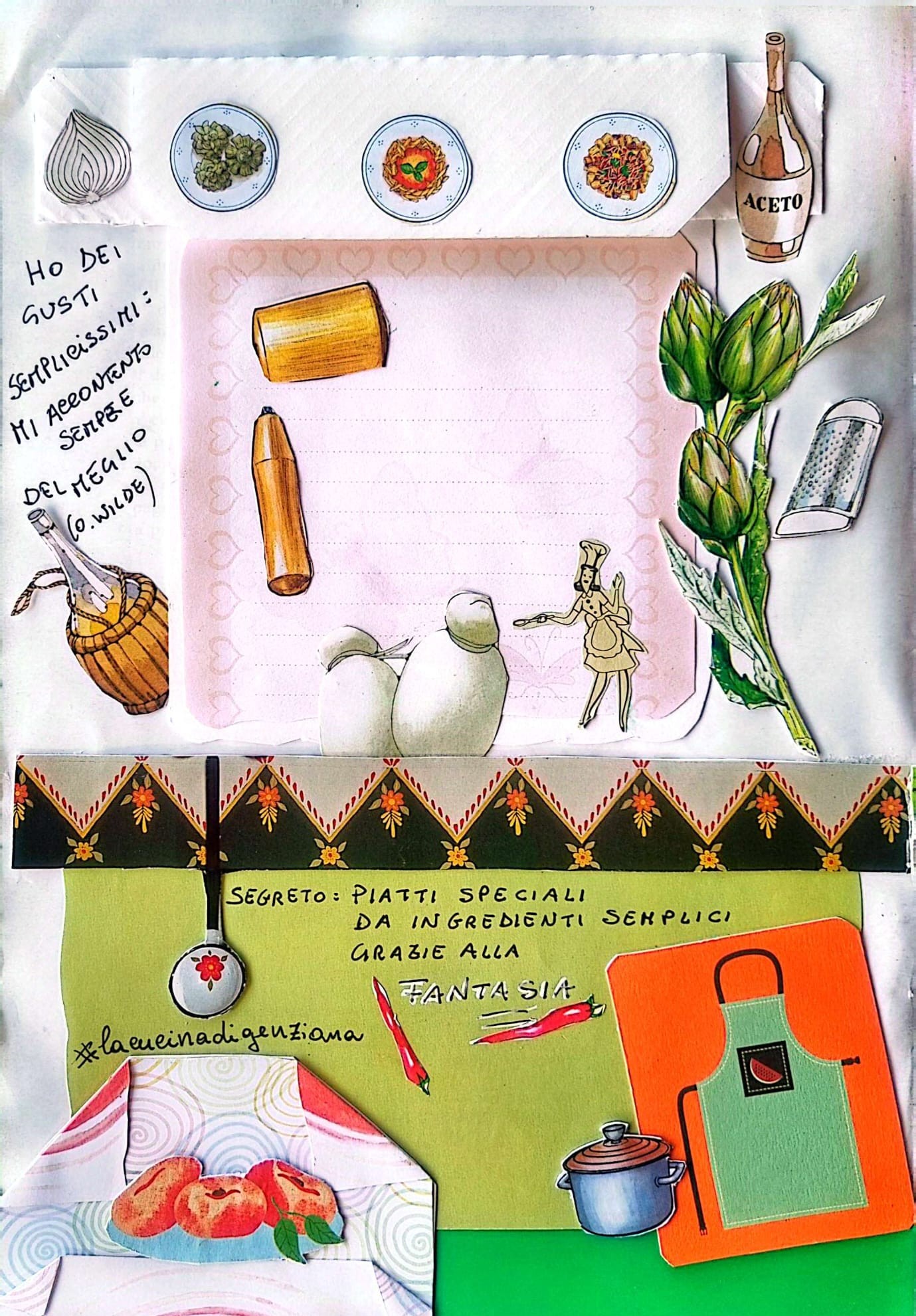 Come ogni martedì Genziana ci dà il buongiorno con una pagina del suo Kitchen Journal, creata insieme a Poppy Spring. Spicca subito una frase di Oscar Wilde: Ho dei gusti semplicissimi: mi accontento sempre del meglio. E così deve essere anche per noi: quando facciamo qualcosa, dobbiamo dare il meglio di noi stessi, sempre meglio e di più. In questo collage ci sono piatti già pronti (anche sotto l’aletta, hai notato?), ingredienti da cucinare e un segreto: Piatti speciali da ingredienti semplici grazie alla fantasia. E alla passione, aggiungo io. Chi cucina con passione impara, con l’esperienza, come esaltare una pietanza, creare nuovi sapori, combinare profumi e aromi. E questo vale anche per chi scrive o si dedica a un’altra attività.