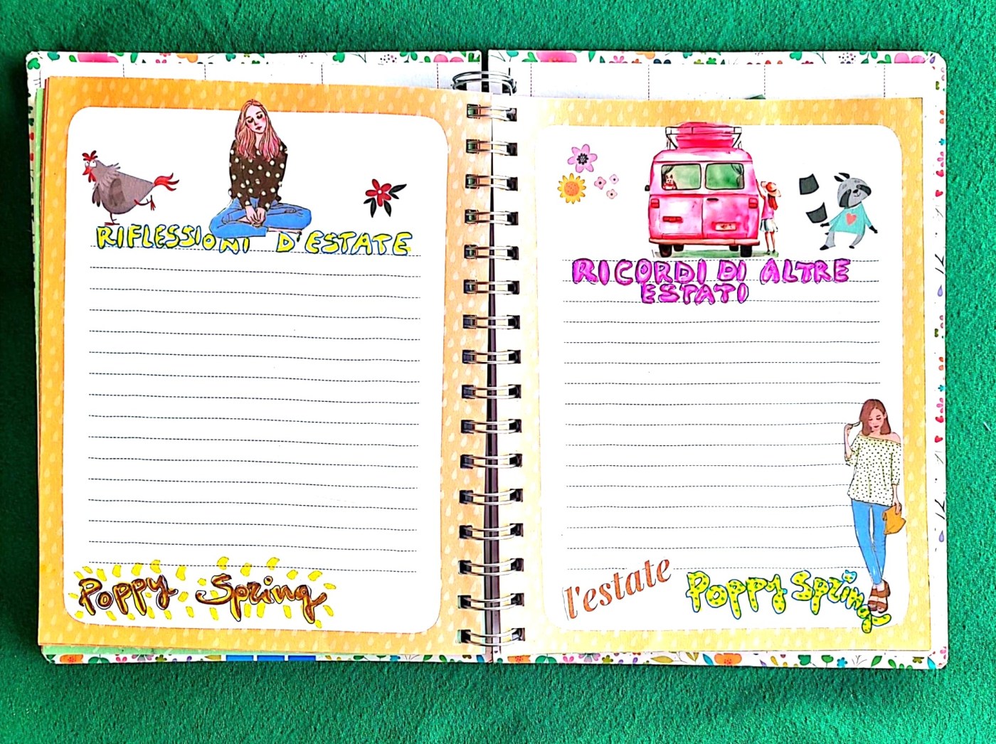 In queste due pagine del journal di Poppy Spring c’è spazio per le nostre riflessioni e per i ricordi di altre estati. Cosa affiora subito alla nostra mente? Persone, luoghi, canzoni, libri, film, incontri speciali? Ogni cosa è importante, perché ha contribuito a definire chi siamo oggi.