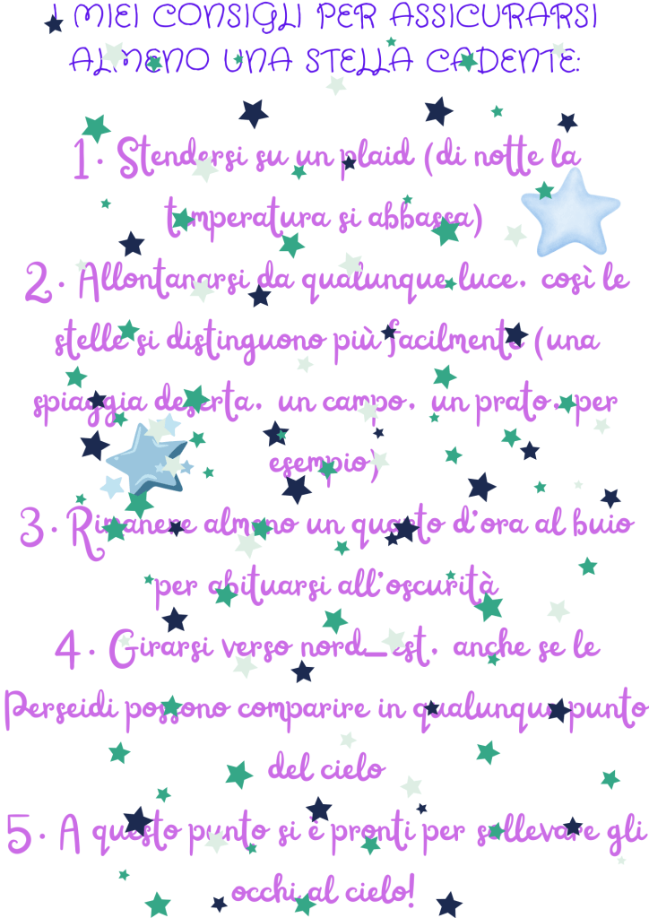 Quando il cielo è tornato nero, era completamente punteggiato di tante luminosissime stelle. E così, all’improvviso, sono spuntati fuori tanti plaid distribuiti da mamma e dalle sue sorelle e ci siamo sdraiati sull’erba ad aspettare che ne cadesse qualcuna per poter esprimere un desiderio (almeno uno!). Sì, perché ieri era la notte di San Lorenzo, non solo la notte appena trascorsa ma anche quelle successive sono ideali per assistere allo spettacolo da brividi che si ripete ogni anno, sempre in questo periodo. Perché? Perché la Terra attraversa in questi giorni una nuvola di polvere lasciata dalla cometa Swift-Tuttle. Entrando nell’atmosfera, le rocce che la compongono sbattono contro l’aria rovente e danno luogo alla scia più bella e luminosa di meteore, le Perseidi. <Se non ne avvistiamo nemmeno una non scoraggiamoci, Poppy> mi ha detto mamma, sdraiata accanto a me. <Abbiamo comunque trascorso una notte magica ad ammirare un cielo di scintillanti cristalli, uno spettacolo di luci in mezzo al buio del cielo sconfinato. Una splendida opportunità per riflettere, soprattutto sui nostri sogni e speranze!> <Ehi…ne ho vista una!> ho gridato in quel momento, tutta allegra indicandola e mettendomi seduta. <E allora esprimi il tuo desiderio!> ha esclamato zia Peonia. E così ho fatto. Uno dei tanti che mi ero preparata. Ho fatto bene a pensare in anticipo ai desideri da esprimere perché poi, presa dalla foga di aver avvistata una stella cadente, ti trovi impreparata e perdi un’opportunità. Ne ho preparati una decina e mi sono contenuta. Magari ci fosse una pioggia di stelle cadenti, io mi troverei con un cestino pronta a raccoglierle tutte, prima che si frantumino a terra!