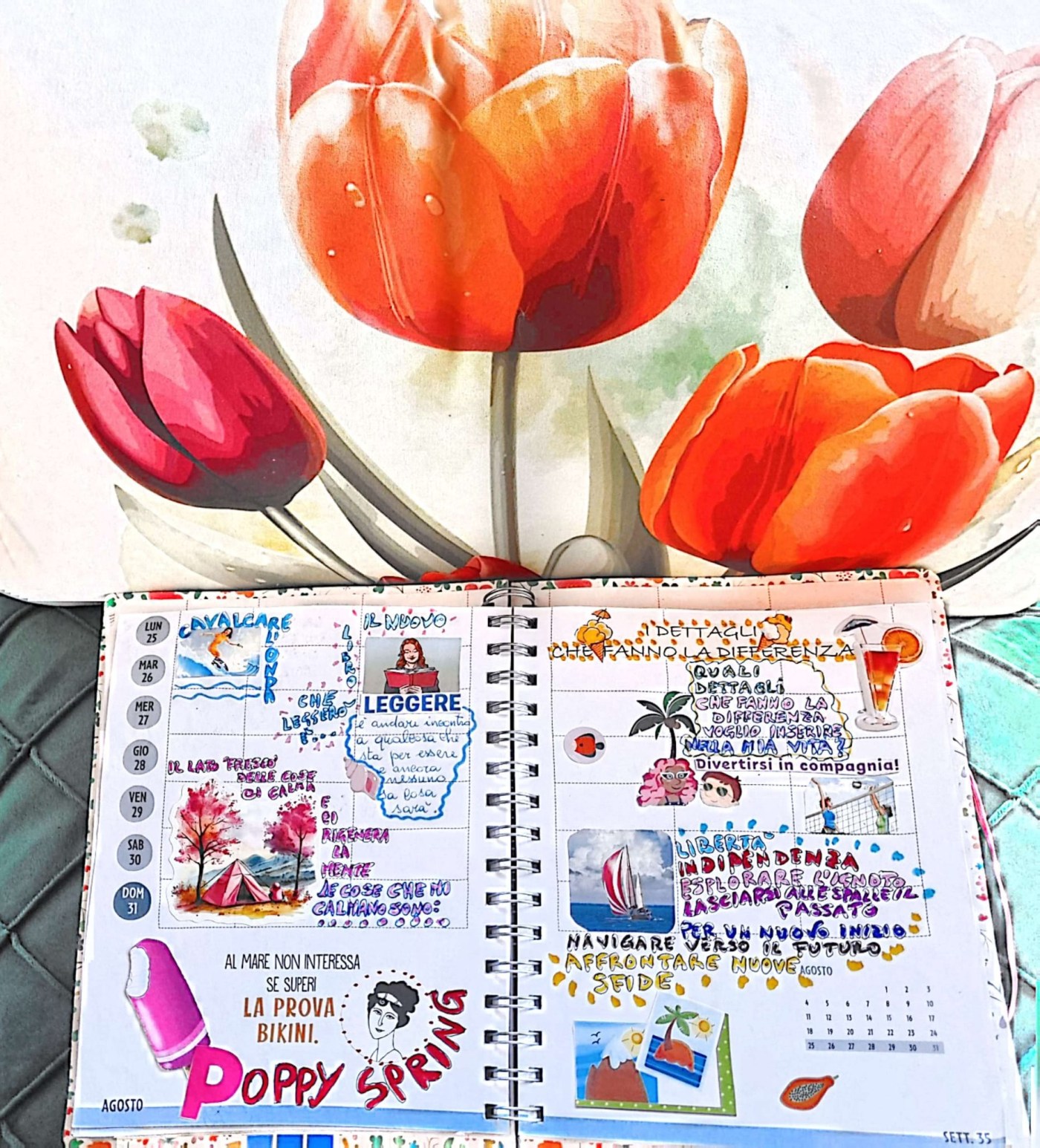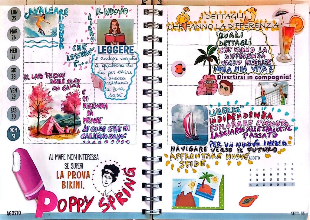 C’è anche l’immagine di un veliero, metafora di libertà e di indipendenza ma non solo: navigare verso il futuro, affrontare nuove sfide, esplorare l’ignoto e lasciarsi alle spalle il passato. Buoni propositi, questi, per la nuova stagione che si sta preparando per subentrare all’estate. Per le altre cose appuntate da Poppy nel suo diario possiamo guardare la foto e lasciarci ispirare.