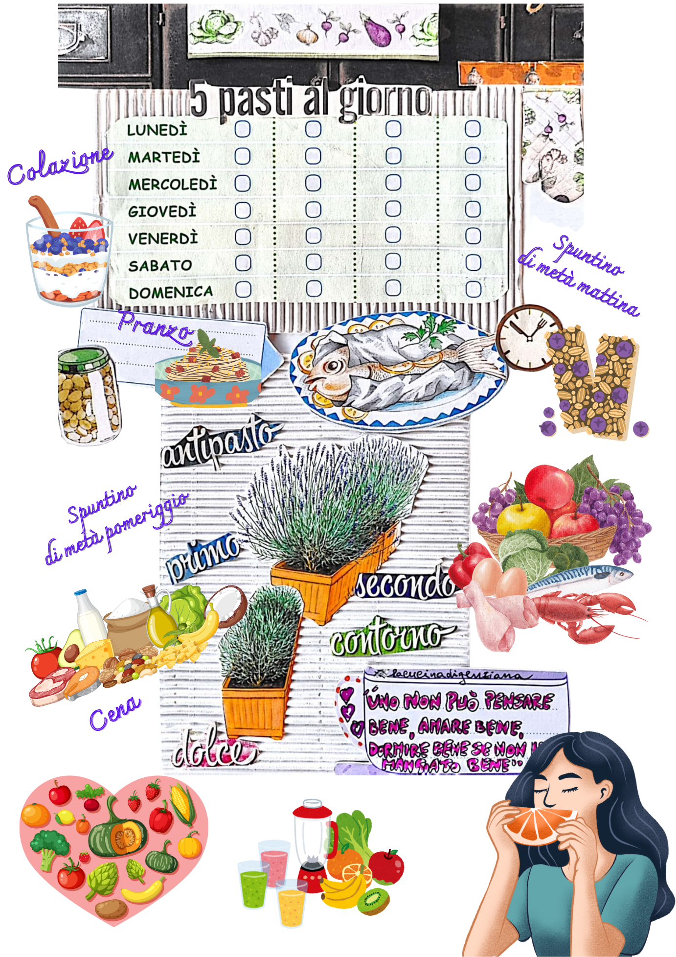 Buongiorno! Oggi, dalla cucina di Genziana, ci arriva questa pagina del suo journal, dedicata al mangiare sano. Cinque pasti al giorno per distribuire per l’energia, per gestire la fame ed evitare di mangiare troppo ai pasti principali e per avere uno stile di vita sano. C’è chi preferisce fare tre pasti al giorno ed evita gli spuntini e va bene anche così, purchè colazione, pranzo e cena siano ben equilibrati. Siamo liberi di scegliere: dipende dalle nostre esigenze, dal nostro stile di vita e anche dai nostri obiettivi di salute.