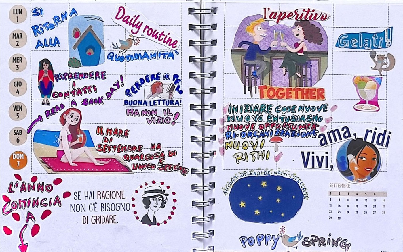 Nella seconda pagina del suo diario Poppy ribadisce il concetto del “passaggio dolce” con immagini di aperitivi con gli amici e con la freschezza dei gelati e fa un promemoria di ciò che pianificherà da qui in poi. Infine, tre parole che devono diventare il nostro stile di vita: VIVI, AMA, RIDI.