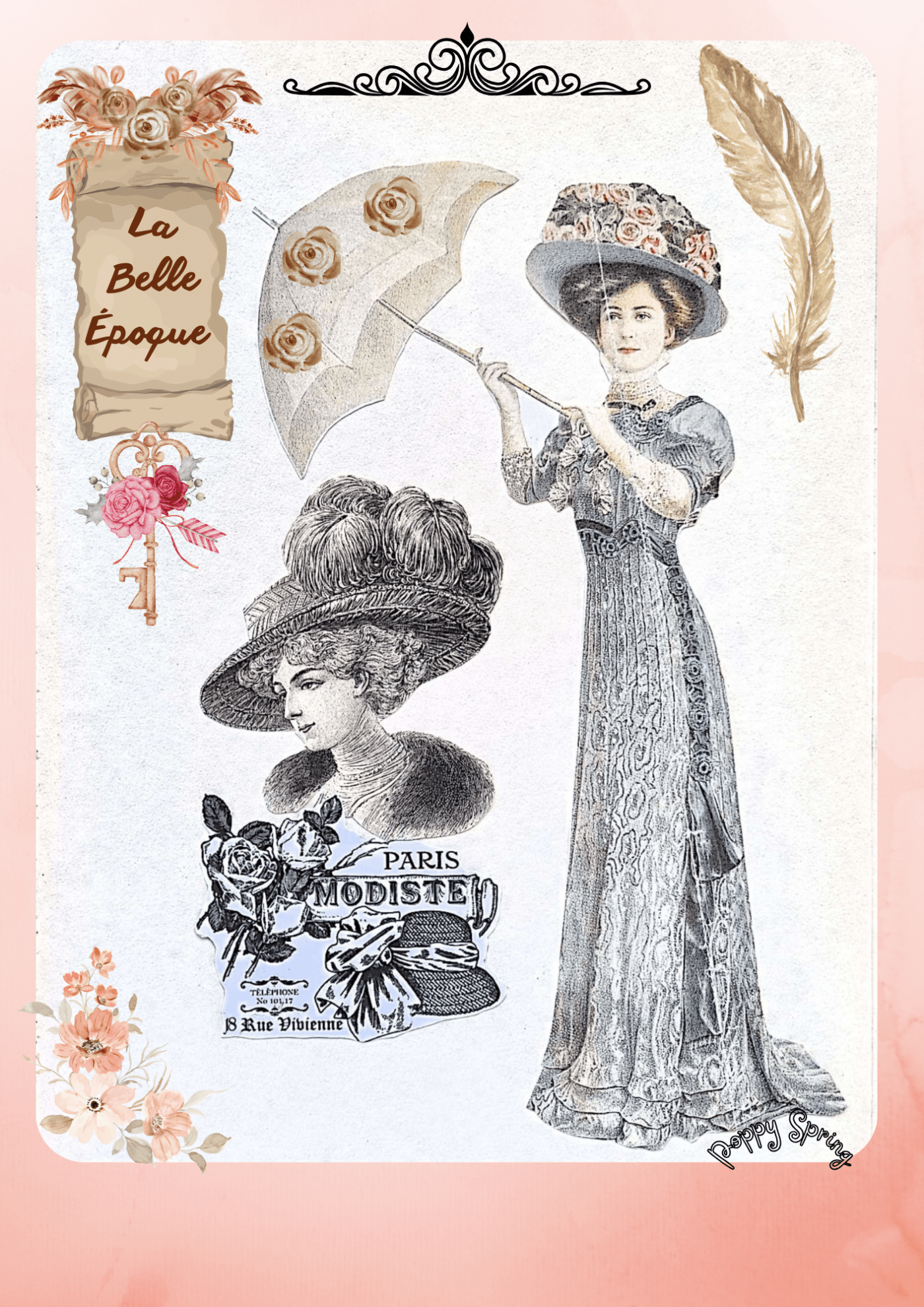 Oggi facciamo un altro viaggetto nella Belle Époque. Questo collage creato da Poppy Spring mette in rilievo i cappelli e la pubblicità di una modista di Parigi. Le modiste parigine erano sarte specializzate, figure centrali nel creare cappelli stravaganti e alla moda, tanto che artisti come Edgar Degas le hanno immortalate nelle loro opere, celebrando l’eleganza e l’abilità artigianale delle loro opere d’arte. Per le donne dell’epoca i cappelli erano un accessorio fondamentale e un simbolo di status sociale perchè indicavano prestigio e ricchezza (le popolane indossavano dei semplici fazzoletti). Le modiste erano abili nell’inventare modelli decorati con vari tessuti – stoffa, pizzo, nastri, piume di struzzo, uccelli del paradiso e chiffon – che poi cucivano per le signore dell’alta società. In molte botteghe, lavoravano direttamente nel negozio, proprio davanti alla vetrina, così le clienti potevano osservare la creazione dei cappelli in tempo reale. Davvero esempi di alta creatività: con ampie tese, poggiati su acconciature voluminose e leggermente inclinati in avanti, i cappelli erano spettacolari e di fogge e materiali di ogni tipo. Le modiste usavano il loro talento e la loro fantasia per creare pezzi unici. Anche i grossi spilloni per tenere fermi i cappelli sulle acconciature erano spesso molto preziosi. Come se tutto questo non bastasse, per sostenere i cappelli più voluminosi c’era il collier de chien, un sostegno per il collo, che divennne anch’esso un ornamento: un colletto alto di stoffa rigido e decorato con perle, paillettes o ricami.