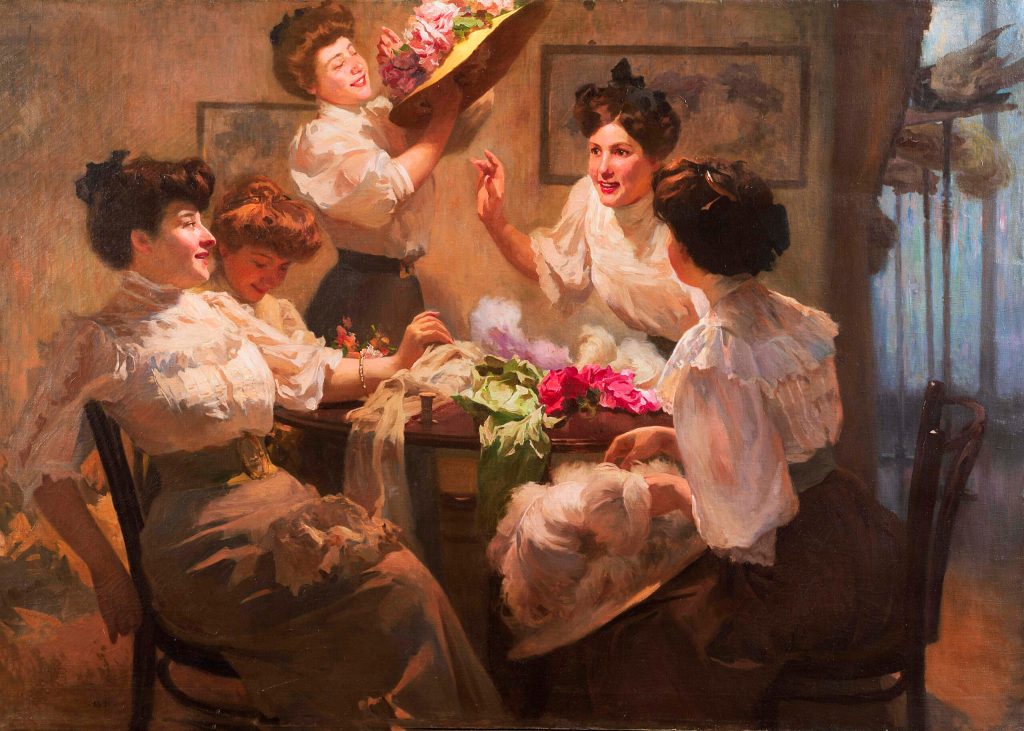 Questo è un dipinto di Fabio Cipolla (Roma, 1852 – 1935). È stupendo: i colori vivaci evidenziano la gioia delle cinque giovani modiste intente ad addobbare i cappelli per le loro clienti.