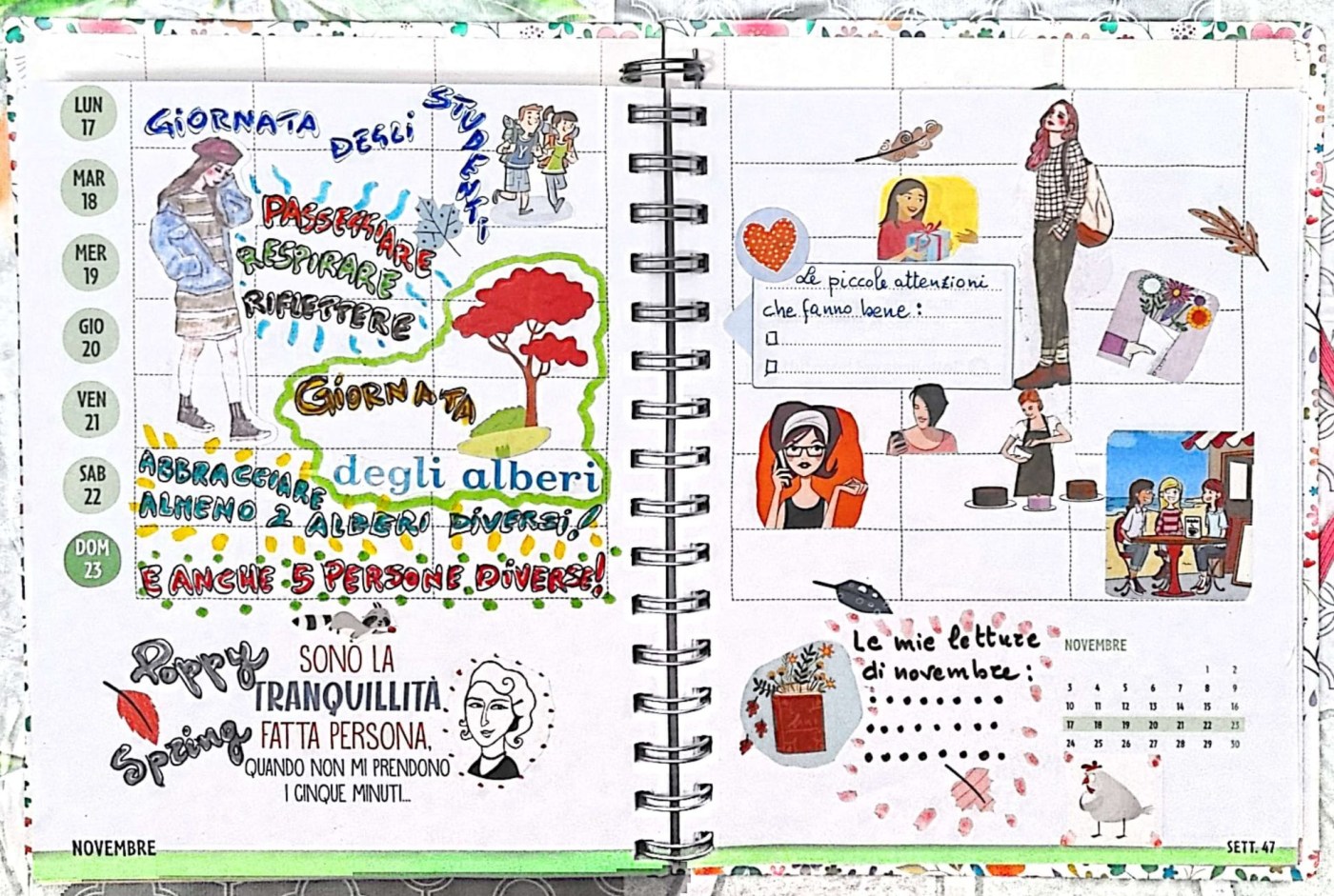 Nel suo diario visivo Poppy Spring ha segnato tre belle ricorrenze di questa settimana: oggi è la Giornata Internazionale degli studenti e venerdì 21 sarà la Giornata Nazionale degli alberi. La prima è importante perchè sottolinea a livello globale il diritto allo studio e alla libertà di espressione; la seconda perchè ricorda l’importanza del patrimonio arboreo e il suo fondamentale contributo per la salute dei nostri ecosistemi.