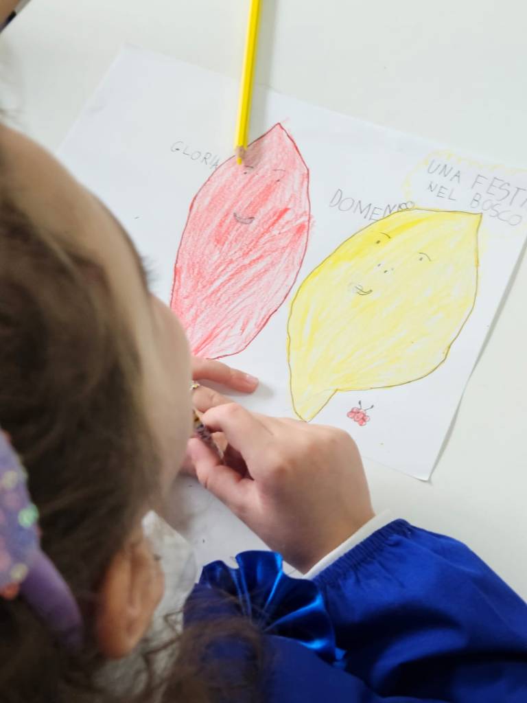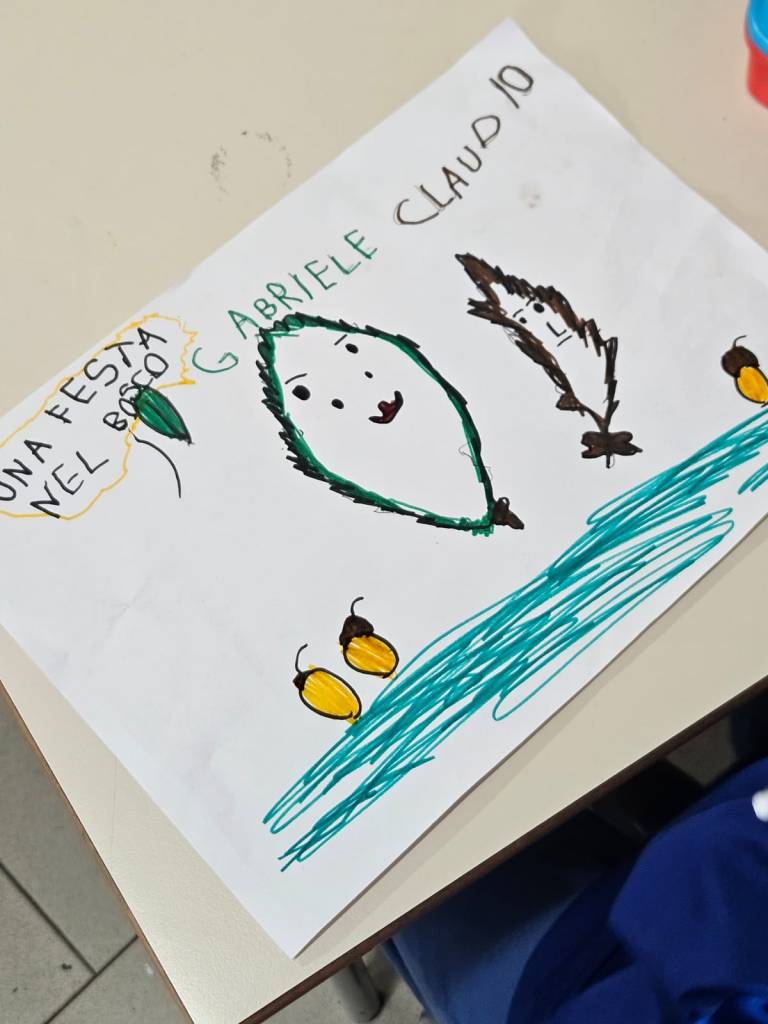 Poi, tutti a disegnare foglie eleganti, gli invitati alla festa (hanno deciso che è una festa di compleanno): scoiattoli, orsi, lupi, cervi, lumache; cibo: castagne, noci, funghi e ghiande e a immaginare un bel luogo nel bosco: un laghetto, intorno a un albero, e così via.