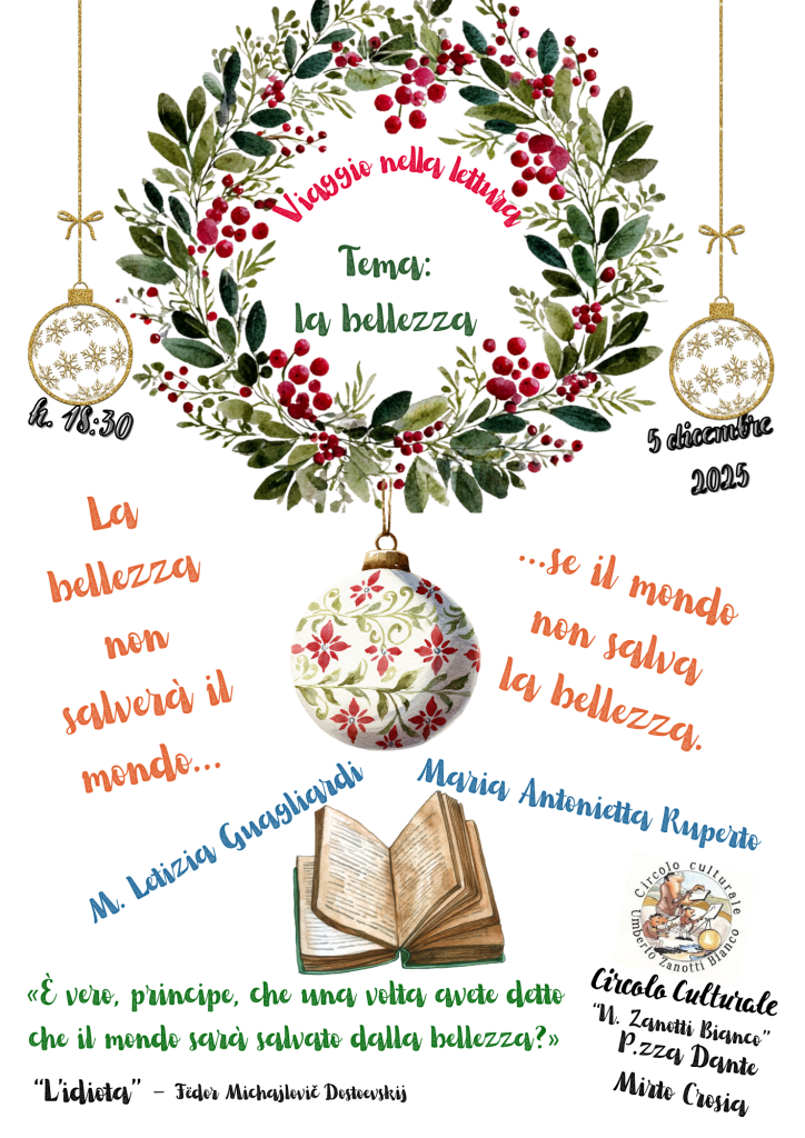 Nel mio terzo viaggio nella lettura che si è svolto ieri nel Circolo Culturale “U. Zanotti Bianco” di Mirto-Crosia ho scelto di condividere alcune considerazioni sul tema della bellezza traendo spunto da “L’idiota”, opera del romanziere russo Fëdor Michajlovič Dostoevskij, pubblicato tra il 1868 e il 1869.