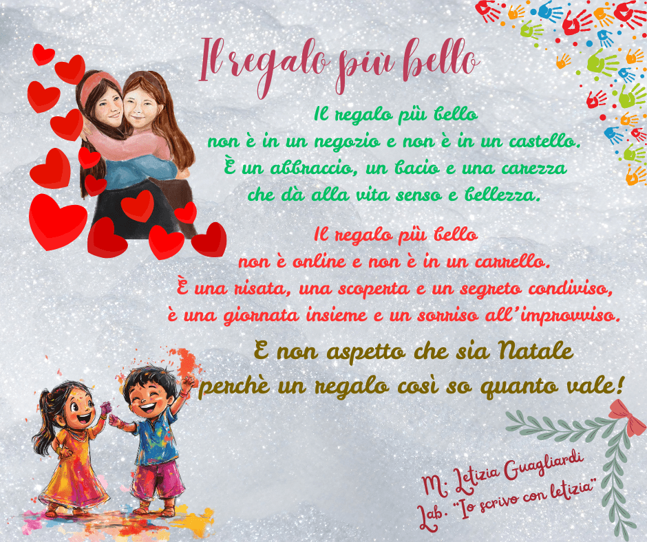 Oggi iniziamo la giornata e anche il fine settimana con questa poesia, scritta durante l’incontro di laboratorio di scrittura creativa di giovedì 11 dicembre con i miei piccoli scrittori di 6 anni. È semplice, con rime facili per i bambini, ma ci fa riflettere sul significato dei gesti gentili e fatti con amore.