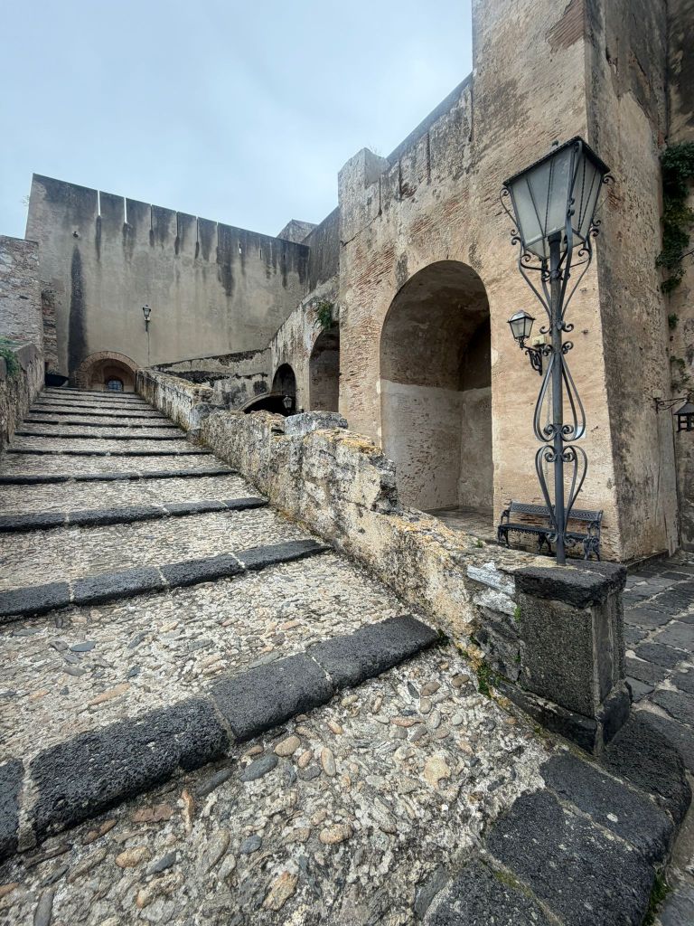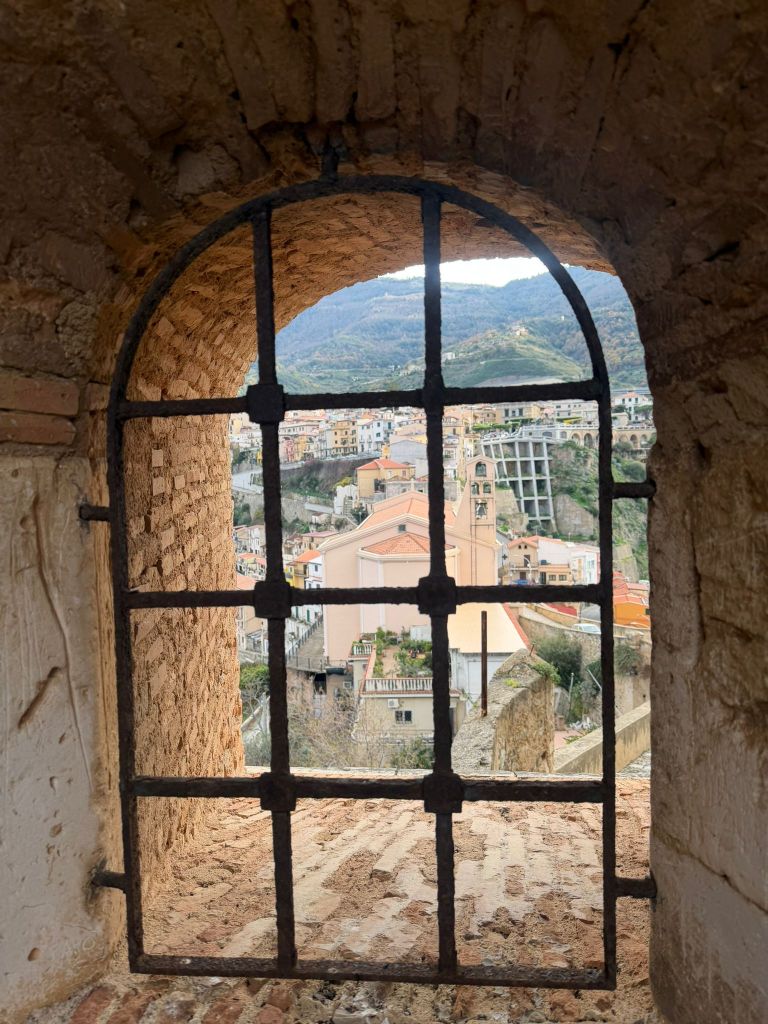 Ho sbirciato dalle feritoie, le sottili finestre che consentivano ai soldati addetti alla difesa del castello di osservare ed eventualmente colpire facilmente gli avversari senza essere visti ma è dall’affaccio in fondo alla Piazza d’Armi che si osserva qualcosa di straordinario: l’imbocco dello Stretto di Messina tra il Promontorio di Capo Pacì da un lato e l’estrema punta della Sicilia dall’altro. Volgendo lo sguardo più a ovest si stagliano nel mare le isole Eolie con lo Stromboli. Già Anassila, tiranno di Reggio nel IV secolo a.C. aveva compreso l’importanza di questo luogo per il controllo dei traffici marittimi commerciali e militari.