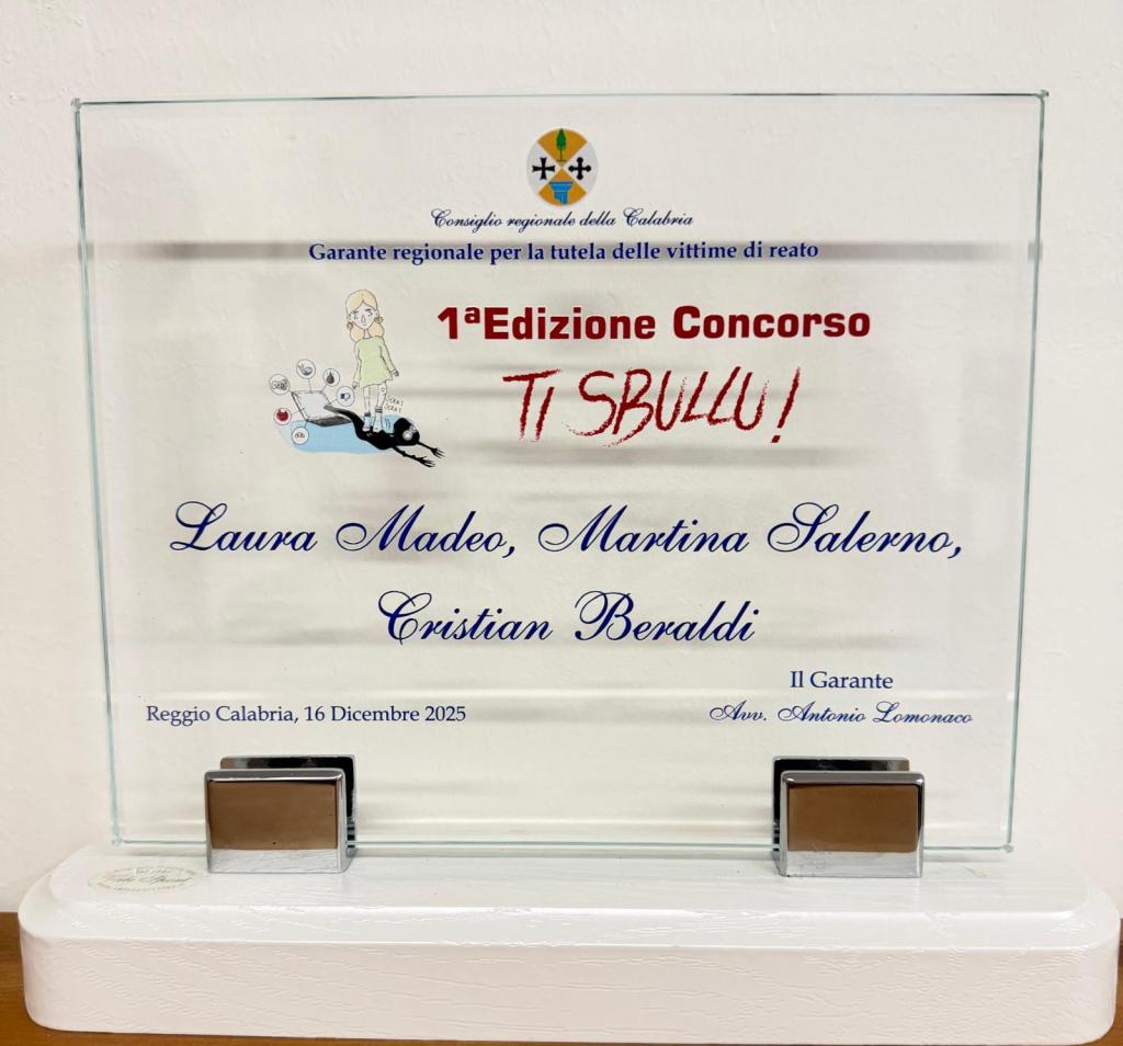Il brano che ascolti mentre leggi si addice allo stato d’animo con cui scrivo questo post: gioia e soddisfazione. Sì, perchè ho ricevuto un bel dono di Natale, un altro bel premio per la mia scuola – l’IIS “E. Majorana” di Corigliano Rossano, per il Dirigente Saverio Madera, per me e per i tre studenti con cui ho partecipato, lo scorso mese di aprile, al concorso “Ti sbullu!”, promosso dal Consiglio Regionale della Calabria e dal Garante regionale per la tutela delle vittime di reato, Avv. Antonio Lomonaco.