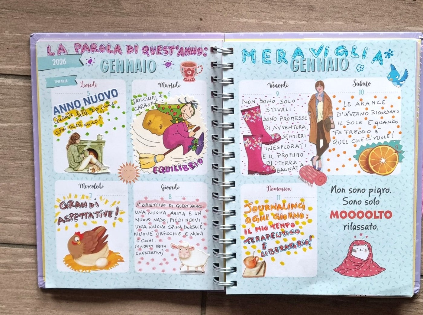 In alto leggiamo la parola che ci accompagnerà in questo nuovo anno: MERAVIGLIA. Di questa bellissima emozione ho scritto un bel po’ nel post di ieri (QUI), quindi ora mi limito a commentare brevemente gli altri giorni.