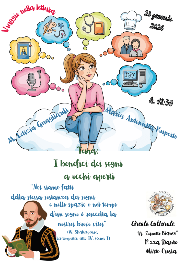Per il viaggio nella lettura di questo mese presso il Circolo Culturale “Zanotti Bianco” di Mirto Crosia ho scelto come tema i sogni, prendendo spunto dalla celebre frase da “La tempesta” (atto IV, scena I) di William Shakespeare: