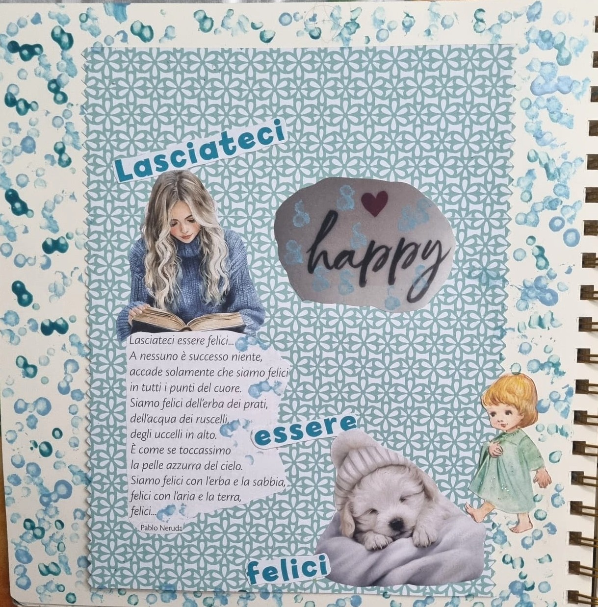 Cosa ci dicono? Che la felicità è un atto di libertà interiore, non dipendente da cause esterne o dalla ricerca di approvazione. Ci invitano a cogliere la gioia semplice e pura, respirando la natura e l’amore con un senso di pienezza assoluta. Anche il collage di Poppy Spring, con i suoi colori pastello sui toni dell’azzurro, ci dà una sensazione di serenità.
