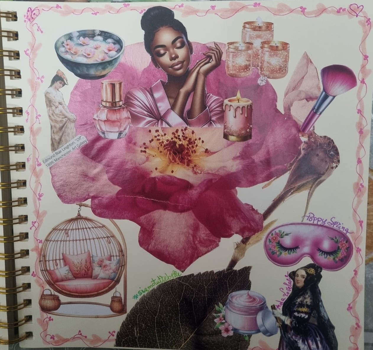 Nel resto del collage tante tonalità di rosa per la bellezza come cura di sè: anche questa è arte. Non è un atto egoistico o vanità ma un atto di responsabilità per ricaricare le energie, prevenire lo stress e coltivare l’equilibrio interiore. Questo tipo di bellezza nutre il corpo, la bellezza dell’arte nutre lo spirito.