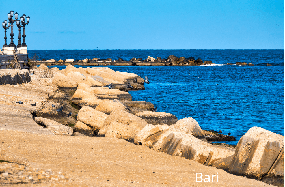 Ed eccoci all’ultima tappa del nostro viaggio d’istruzione in Puglia: Bari. La nostra esplorazione inizia dal suo lungomare, uno dei più lunghi e suggestivi d’Europa, con i suoi oltre 15 km. Realizzato principalmente tra gli anni ’20 e ’30, collega il porto alla spiaggia di “Pane e Pomodoro”. Prende questo nome dalla tradizione popolare dei baresi che un tempo frequentavano questo luogo portando con sé un pranzo semplice e genuino: pane e pomodoro. Era il tipico pasto povero ma gustoso consumato in spiaggia. Il lungomare è davvero bello: lampioni storici (ben 197), vista panoramica sull’Adriatico e architettura monumentale. Un abbraccio fra la zona nord (la Fiera del Levante) e la zona sud (la Baia di San Giorgio).