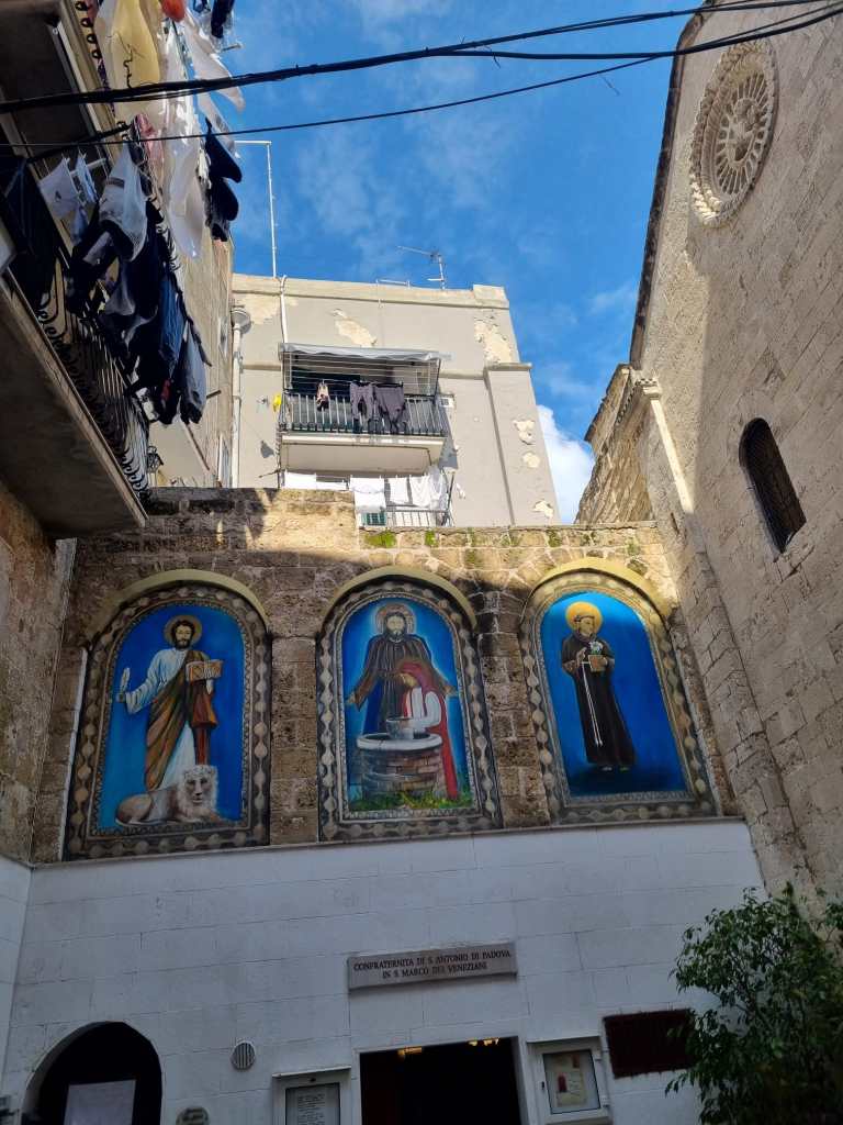 Proseguiamo verso il centro storico, noto come Bari Vecchia, il cuore pulsante della città. È un suggestivo groviglio di vicoli stretti e irregolari, situato su una penisola tra il Porto Vecchio e il Porto Grande. Qui il tempo sembra essersi fermato: balconi adornati, panni stesi e l’odore tipico della focaccia barese appena sfornata. E qui c’è la “Via delle orecchiette” (Via dell’Arco Basso), un vicolo caratteristico dove le signore locali (Nunzia e Rosa sono le più famose) preparano, espongono e vendono artigianalmente le orecchiette fresche sui tavoli di legno davanti alle loro case.