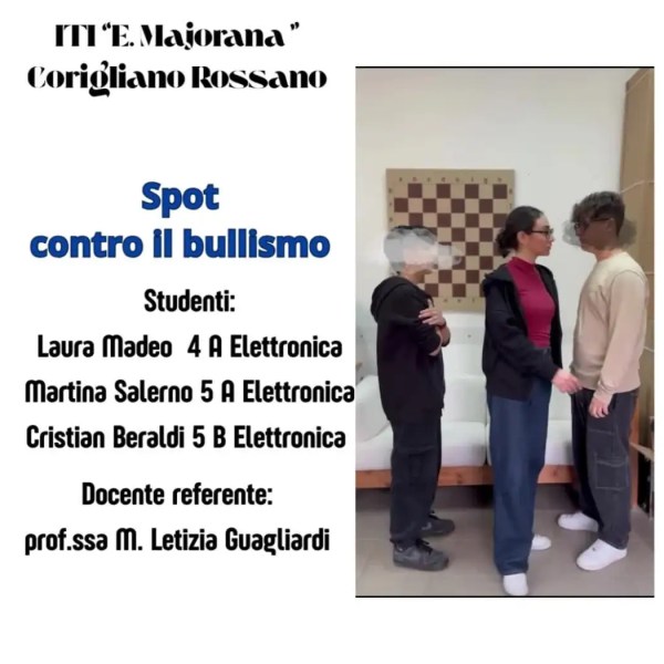 https://videopress.com/v/BOuewQ8y?resizeToParent=true&cover=true&preloadContent=metadata&useAverageColor=true Questo video, realizzato da tre studenti dell'ITI "E. Majorana" di Corigliano Rossano, è stato concepito come uno spot pubblicitario e mette in risalto un fattore molto importante: sia il bullo che la persona bullizzata soffrono. Questo è messo in evidenza con la presenza di due nuvole: quella nera avvolge la testa del bullo (Cristian... Continua a leggere →